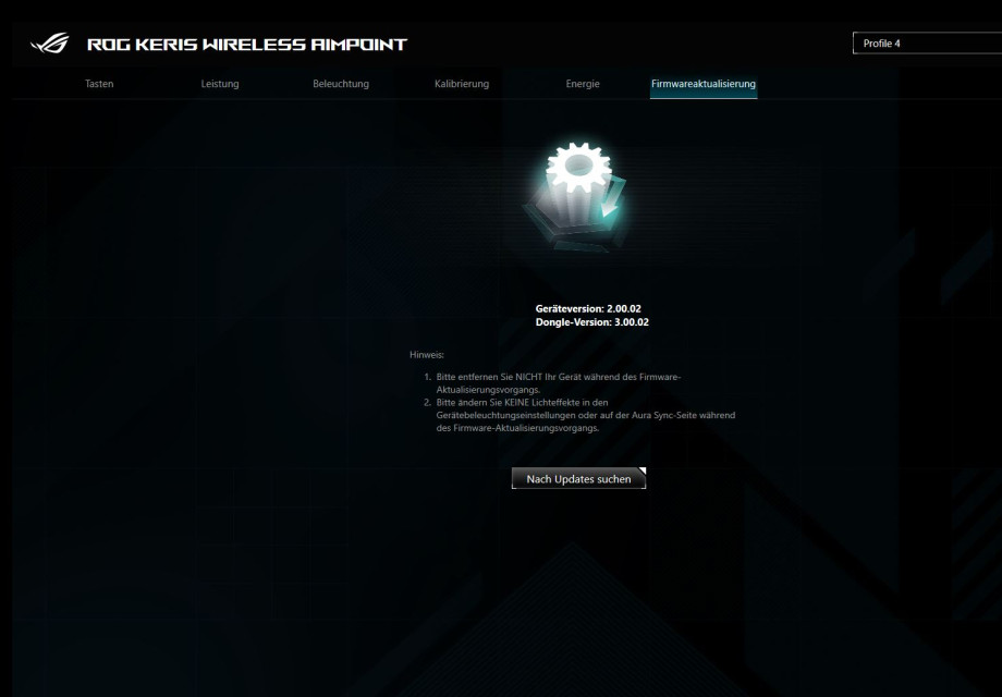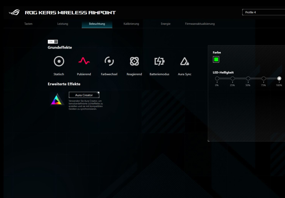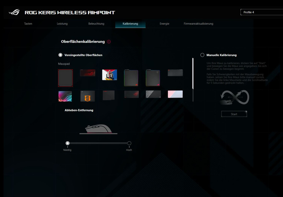 Die passende Software zur Maus gibt es direkt bei Asus zum Herunterladen. Zusätzlich bietet die Armoury Crate Software allerhand Möglichkeiten, seine Maus zu individualisieren. Gut ist, dass die Maus nicht via Kabel verbunden werden muss, die Software erkennt die Maus via USB-Dongle (Bluetooth konnte nicht getestet werden). Jede Taste bis auf die linke Maustaste kann in ihrer Funktion bearbeitet werden. Von Makros bis Kürzel oder einer anderen Funktion ist alles möglich. Wem die dpi Taste auf der Unterseite bspw. fehlplatziert ist, kann eine der Daumentasten zu dieser umfunktionieren. Unter dem Leistungs-Tab können wir die voreingestellten dpi Profile sowie deren Farben bearbeiten. Außerdem kann hier auch die Abfragerate geändert oder die Winkelerfassung aktiviert und bearbeitet werden. Die Beleuchtung lässt sich ebenfalls komplett anpassen. Neben vorgefertigten Profilen wie der Batteriemodus, der uns mithilfe der Farbe den Batteriestatus mitteilt, können wir mit dem Aura Creator von Asus auch komplett eigens komponierte Farbspielereien erstellen. Natürlich lässt sich die Beleuchtung auch ausschalten. Falls man Probleme mit seiner Oberfläche hat, lässt sich die Maus auf der Oberfläche auch neu kalibrieren. So können voreingestellte Profile genutzt werden und auch manuell angelegt werden. Wie weit die Maus von der Oberfläche abgehoben werden kann, ist ebenfalls mit einem Slider einstellbar. Der Energie-Tab zeigt den Batteriestatus in Prozent an. Eine Anpassung für den Energiesparmodus der Maus in Minuten ist ebenfalls möglich. Auch die Firmware kann hier aktualisiert werden. Die gesamte Anpassung und Bedienung der Software ist sehr einfach gehalten. Rundum eine gelungene Software, in welcher man sich schnell orientieren kann.