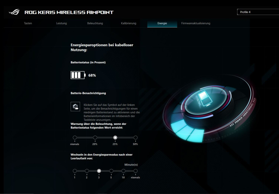 Die ROG Keris Wireless AimPoint kam von Werk aus bereits mit neuster Software und knapp 75 % Akkulaufzeit. Nach rund 10 Stunden Nutzung ist die Maus noch bei satten 68 % und macht trotz aktivierten Ruhemodus nach 3 Minuten keine Probleme, sobald man die Maus wieder benutzt. Sollte die Maus unter 25 % kommen, färbt sich das ROG-Logo auf der Maus Rot. Zwar ist die farbliche Markierung unter der Hand, doch durch die lange Laufzeit fällt es früher oder später jedem auf. Falls man die Software installiert hat, findet man dort ebenfalls alle Informationen zum Batteriestatus in % Angaben. Sollte man die Maus mit dem beigelegten Kabel nutzen, verspürt man nahezu keinen Unterschied. Durch die sehr gute Verarbeitung gleitet das Kabel, ohne zu stoppen mit der 75 g Maus mit. Vollgeladen ist die Keris in wenigen Stunden, eine genaue Angabe kann nicht getätigt werden. Der Akku lässt sich in der Theorie wechseln, da dieser nicht fest verlötet, sondern lediglich gesteckt ist.
