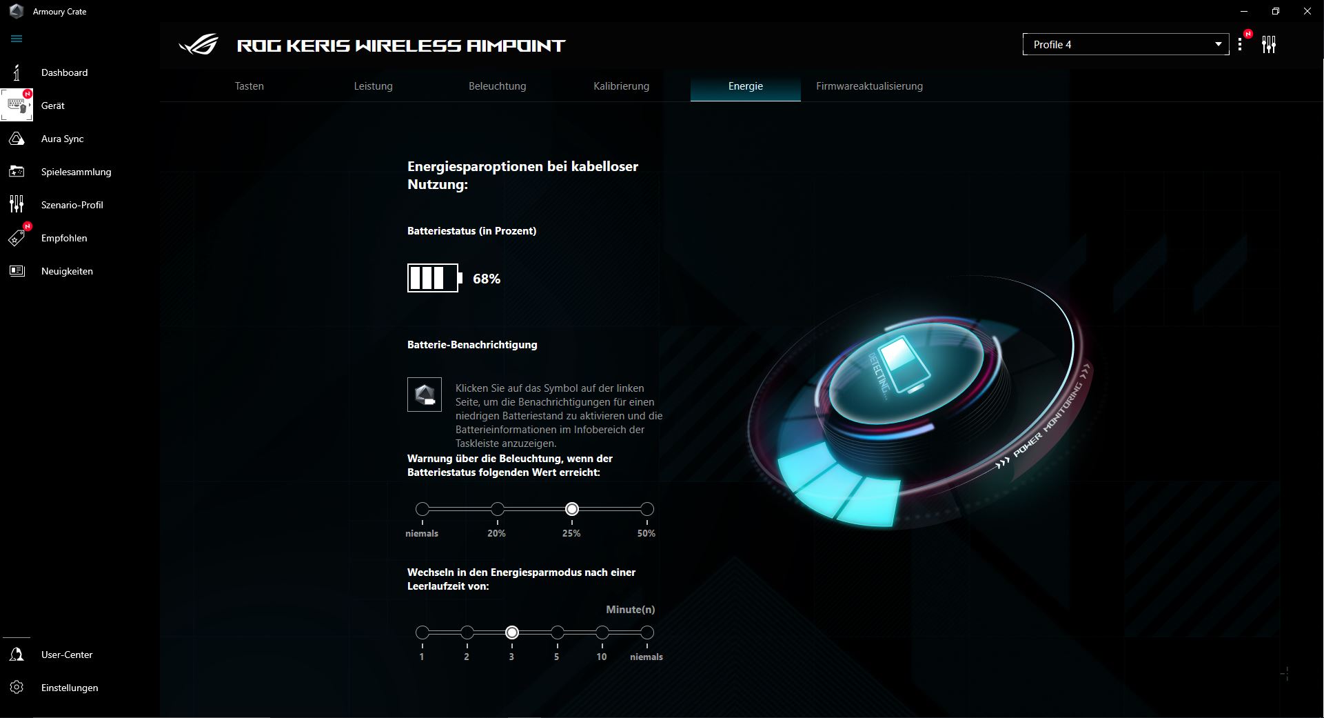 Die ROG Keris Wireless AimPoint kam von Werk aus bereits mit neuster Software und knapp 75 % Akkulaufzeit. Nach rund 10 Stunden Nutzung ist die Maus noch bei satten 68 % und macht trotz aktivierten Ruhemodus nach 3 Minuten keine Probleme, sobald man die Maus wieder benutzt. Sollte die Maus unter 25 % kommen, färbt sich das ROG-Logo auf der Maus Rot. Zwar ist die farbliche Markierung unter der Hand, doch durch die lange Laufzeit fällt es früher oder später jedem auf. Falls man die Software installiert hat, findet man dort ebenfalls alle Informationen zum Batteriestatus in % Angaben. Sollte man die Maus mit dem beigelegten Kabel nutzen, verspürt man nahezu keinen Unterschied. Durch die sehr gute Verarbeitung gleitet das Kabel, ohne zu stoppen mit der 75 g Maus mit. Vollgeladen ist die Keris in wenigen Stunden, eine genaue Angabe kann nicht getätigt werden. Der Akku lässt sich in der Theorie wechseln, da dieser nicht fest verlötet, sondern lediglich gesteckt ist.