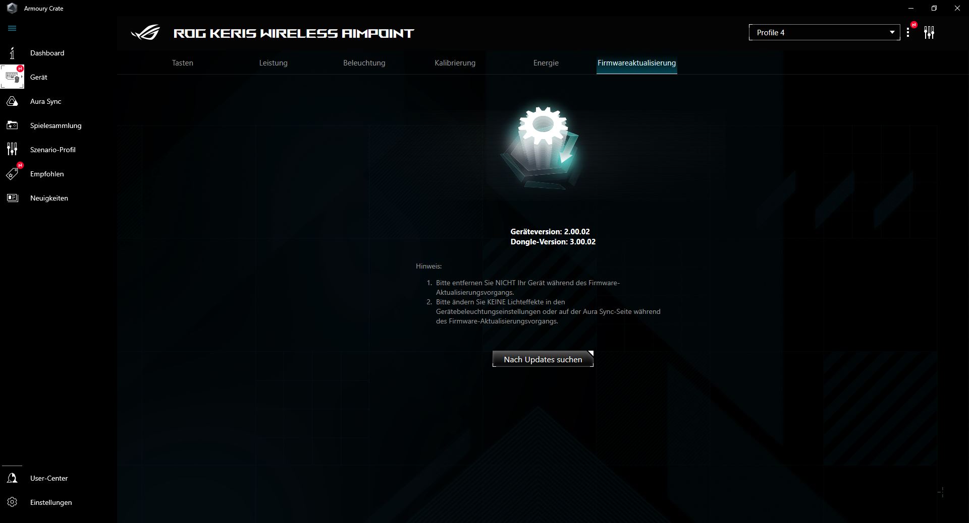 Die passende Software zur Maus gibt es direkt bei Asus zum Herunterladen. Zusätzlich bietet die Armoury Crate Software allerhand Möglichkeiten, seine Maus zu individualisieren. Gut ist, dass die Maus nicht via Kabel verbunden werden muss, die Software erkennt die Maus via USB-Dongle (Bluetooth konnte nicht getestet werden). Jede Taste bis auf die linke Maustaste kann in ihrer Funktion bearbeitet werden. Von Makros bis Kürzel oder einer anderen Funktion ist alles möglich. Wem die dpi Taste auf der Unterseite bspw. fehlplatziert ist, kann eine der Daumentasten zu dieser umfunktionieren. Unter dem Leistungs-Tab können wir die voreingestellten dpi Profile sowie deren Farben bearbeiten. Außerdem kann hier auch die Abfragerate geändert oder die Winkelerfassung aktiviert und bearbeitet werden. Die Beleuchtung lässt sich ebenfalls komplett anpassen. Neben vorgefertigten Profilen wie der Batteriemodus, der uns mithilfe der Farbe den Batteriestatus mitteilt, können wir mit dem Aura Creator von Asus auch komplett eigens komponierte Farbspielereien erstellen. Natürlich lässt sich die Beleuchtung auch ausschalten. Falls man Probleme mit seiner Oberfläche hat, lässt sich die Maus auf der Oberfläche auch neu kalibrieren. So können voreingestellte Profile genutzt werden und auch manuell angelegt werden. Wie weit die Maus von der Oberfläche abgehoben werden kann, ist ebenfalls mit einem Slider einstellbar. Der Energie-Tab zeigt den Batteriestatus in Prozent an. Eine Anpassung für den Energiesparmodus der Maus in Minuten ist ebenfalls möglich. Auch die Firmware kann hier aktualisiert werden. Die gesamte Anpassung und Bedienung der Software ist sehr einfach gehalten. Rundum eine gelungene Software, in welcher man sich schnell orientieren kann.