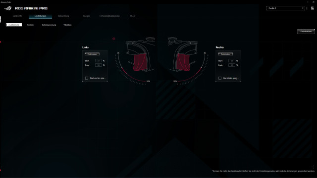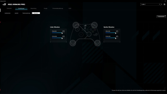 Unter dem Reiter Einstellungen befinden sich vier Untermenüs. Angefangen bei den Triggern, hier „Auslösetaste“, kann die Empfindlichkeit der beiden Tasten eingestellt werden. In der Standardeinstellung reagiert der Trigger, nachdem die Taste zu 33% gedrückt wurde und erreicht den vollen Anschlag, wenn die Taste bereits zu 50% gedrückt wurde, auch wenn die Taste physikalisch noch weiter gedrückt werden kann. Dies lässt sich bei Bedarf direkt am Controller anpassen und wird von der Software visuell dargestellt und gespeichert. Im Reiter „Joystick“ kann auch die Empfindlichkeit der beiden Daumentasten eingestellt werden. Hierfür stehen bereits drei vordefinierte Profile zur Auswahl, es können jedoch bis zu zwei weitere benutzerdefinierte Profile in der Software gespeichert werden. Unter „Tastenbelegung“ können wir die Makrotasten auf der Unterseite bearbeiten. Hier stehen vier Optionen zur Verfügung, darunter auch die Deaktivierung. Auch die Vibration lässt sich im gleichnamigen Reiter einstellen. Insgesamt verfügt der ASUS ROG Raikiri Pro Controller über vier Vibrationsmotoren, die in ihrer Stärke vollständig einstellbar sind.