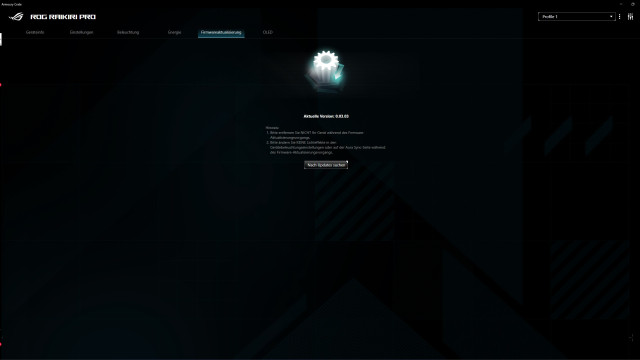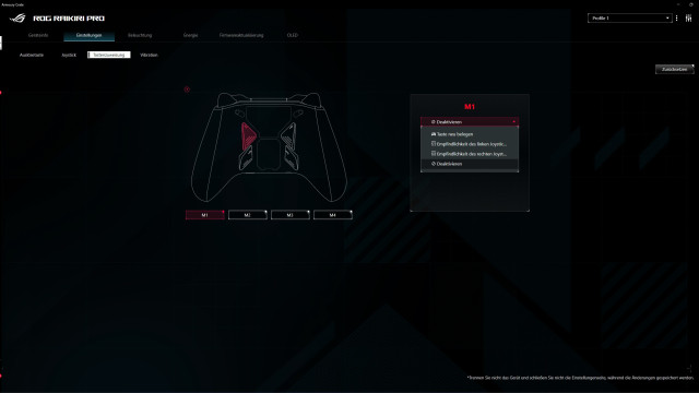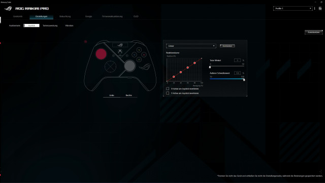 ASUS setzt bei allen Peripheriegeräten auf die Software „Armoury Crate“. Diese bietet wie gewohnt zahlreiche Einstellungsmöglichkeiten. Sobald der ASUS ROG Raikiri Pro Controller per Kabel mit dem PC verbunden ist, können wir verschiedene Einstellungen vornehmen, um unser Spielerlebnis zu verbessern. Dabei können wir unsere Einstellungen in bis zu vier verschiedenen Profilen speichern und bei Bedarf über das integrierte OLED Display abrufen.