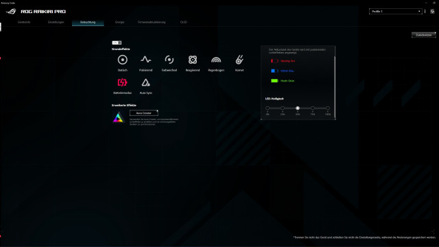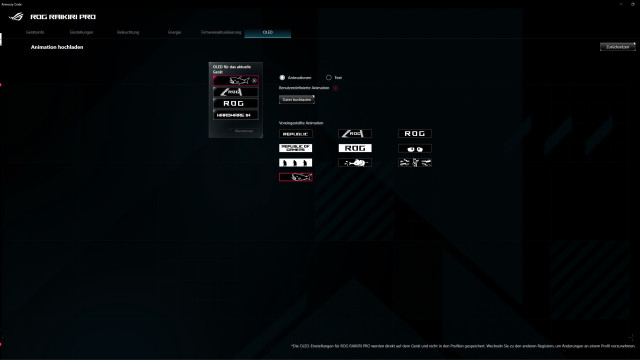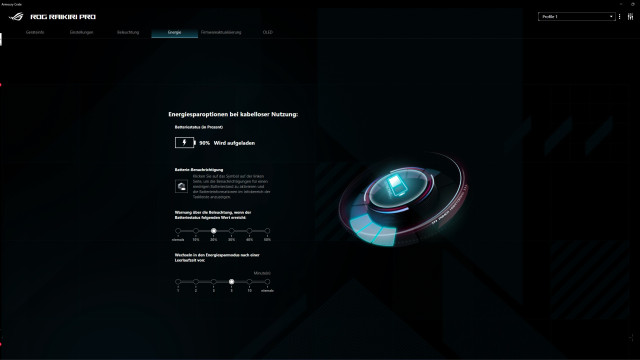 Über den Reiter Beleuchtung kann der RGB-Streifen, der sich durch den Controller zieht, angepasst werden. Neben diversen Einstellungen, die man auch von Tastaturen und Co. kennt, wie Reagieren oder Aura Sync Modus, kann auch der Batteriestatus farblich angezeigt werden. Dabei pulsiert das Gamepad in drei verschiedenen Farben – je nach Ladezustand der Batterie. Unter Energie sehen wir nicht nur den aktuellen Batteriestatus in Prozent, sondern können auch einstellen, wann der Controller uns warnen soll, sobald ein definierter Prozentsatz erreicht ist oder wann das Gamepad in den Energiesparmodus wechseln soll. Unter OLED können wir benutzerdefinierte oder vordefinierte Animationen auf dem Display anzeigen. Auch Text kann hier angezeigt werden, wobei man hier auf 20 Zeichen beschränkt ist und der Text immer über das Display gescrollt wird.