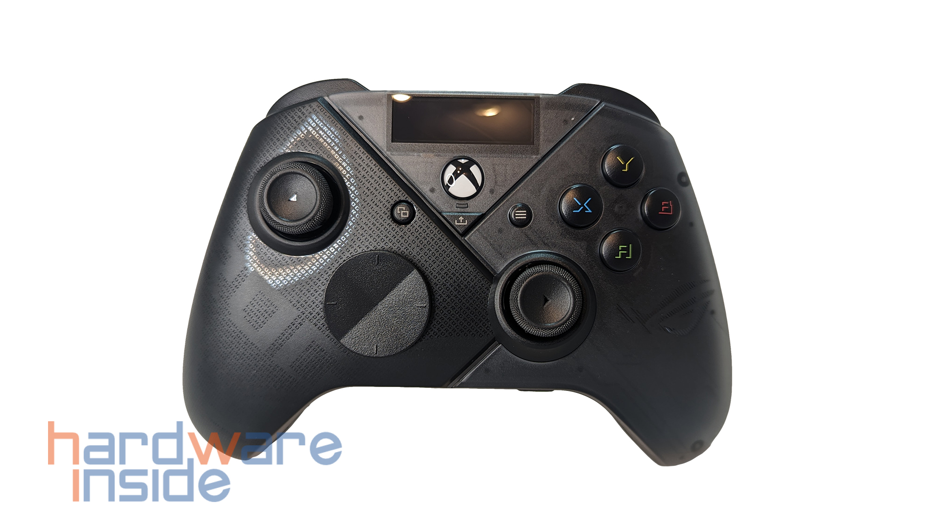 Zumindest von der Silhouette her ist der ASUS ROG Raikiri Pro Controller dem Xbox Wireless Controller nachempfunden. Das Design selbst ist sehr ROG typisch futuristisch. Der Controller ist in zwei Hälften geteilt, in der Einkerbung befindet sich ein RGB Streifen, der in der Armoury Crate nach Belieben verändert werden kann. Die linke Seite beherbergt das D-Pad in rundem Design, einen Thumbstick und den View-Button vor einem dunklen Hintergrund mit fließendem ROG Schriftzug. Die rechte Seite hat einen transparenten Look mit dem ROG Logo unter den X, Y, A und B Tasten. Hier befinden sich auch der zweite Thumbstick und der Menü-Button. In der Mitte oben befindet sich das 1.3″ kleine OLED Display, direkt darunter der Xbox Button sowie die Share-Taste. Zwischen den letztgenannten Tasten befindet sich eine kleine LED, die unter anderem den Verbindungsstatus anzeigt.