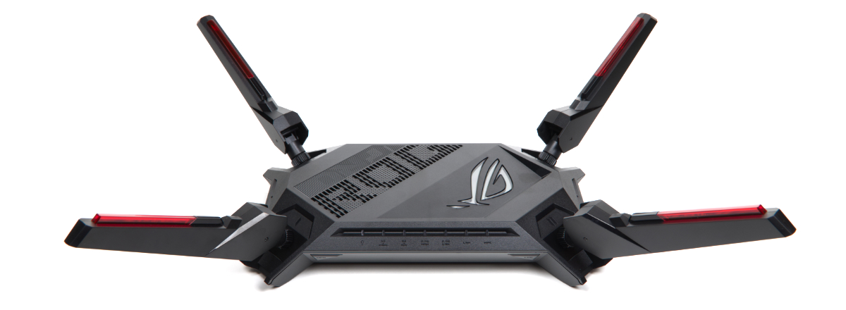 Der ASUS ROG Rapture GT-AX6000 ist optisch sehr aggressiv und daher ohne Zweifel Teil der ROG-Familie. Das schwarze Kunststoff-Gehäuse fühlt sich hochwertig an, die „ROG“-Beschriftung samt beleuchtetem Logo passt gut ins Konzept. Mit über 1100 g ist der Router schwerer als erwartet, wiegt doch eine FritzBox! 7590 nur etwa die Hälfte. Der Router setzt auf vier, von außen verschraubbare, Antennen. Diese sind farblich passend aus schwarzem Kunststoff hergestellt und mit einer schlicht wirkenden Schiene aus rotem Plastik ergänzt. Auf der vorderen Unterseite befinden sich zwei Schalter, einer für WPS und einer zum Durchschalten der Beleuchtung. Die restlichen Schalter befinden sich auf der Rückseite des Routers. Auf der Vorderseite oben sind LED-Anzeigen eingelassen, die den aktuellen Betriebsstatus des Routers anzeigen. Damit lässt sich erkennen, welches Frequenzband momentan aktiv ist und ob die hinteren Ports in Verwendung sind.