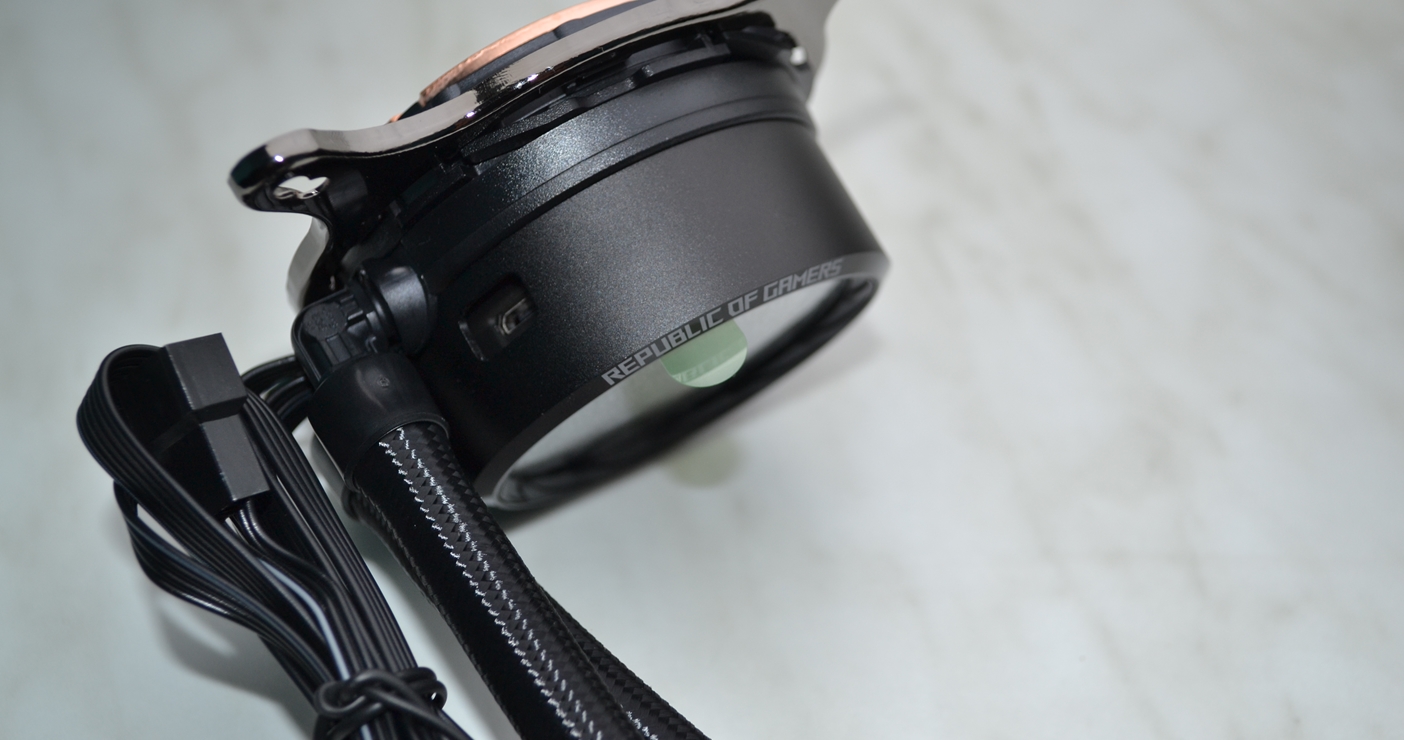 Das Gehäuse des Kühlers besteht aus Kunststoff. An der Unterseite verfügt er über eine Kupferplatte, die dazu dient die Wärme des Prozessors an das Wasser zu übertragen. ASUS hat hier bereits Wärmeleitpaste aufgetragen. Die gesleevten Schläuche (38cm lang) sind beweglich am Kühler befestigt, sodass noch etwas Bewegungsspielraum zur besseren Verlegung vorhanden ist.