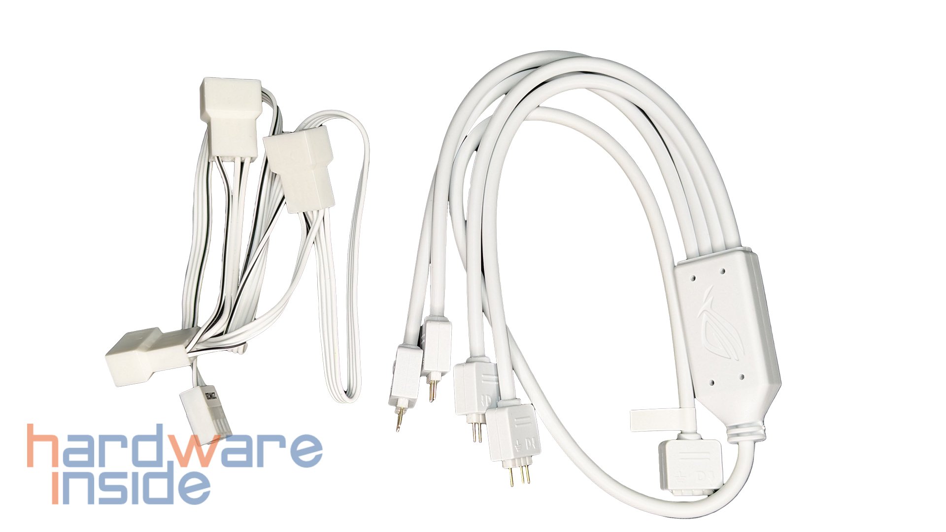 Dem ASUS ROG STRIX LC III 360 ARGB liegen passend zum weißen Thema der AIO die Splitter für ARGB und PWM bei. So müssen wir jeweils nur einen Header auf dem Mainboard belegen und können den Anschluss dann über diese auf die Gehäuserückwand umverteilen. Der ARGB-Splitter hat zusätzlich noch einen weiteren Anschluss, um das Signal z. B. an einen ARGB-Hub weiterzuleiten.