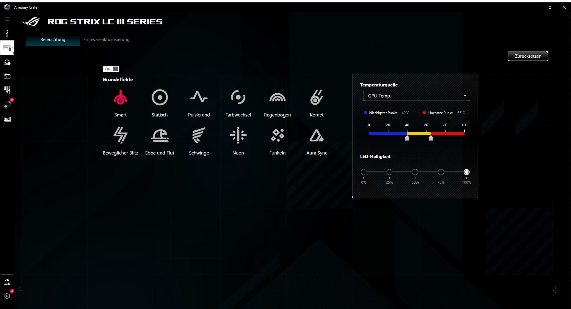 Softwaretechnisch können wir auf Armoury Crate zurückgreifen, mit dem wir unsere Beleuchtung einstellen können. Für unsere Wasserkühlung stehen 10 Grundeffekte zur Verfügung, mit denen wir das ROG-Logo unterschiedlich leuchten lassen können. Auch Aura Sync wird unterstützt, so dass wir einheitliche Farbeffekte erzielen können. Der „Smart“ Modus lässt das Logo abhängig von der GPU-Temperatur in verschiedenen Farben leuchten. Dabei können wir selbst entscheiden, ab welchen Temperaturgrenzen es anders leuchtet, aber die Farbe kann nicht angepasst werden. Außerdem können wir damit nur die GPU-Temperatur farblich darstellen, nicht aber die CPU-Temperatur, was etwas seltsam erscheinen mag.