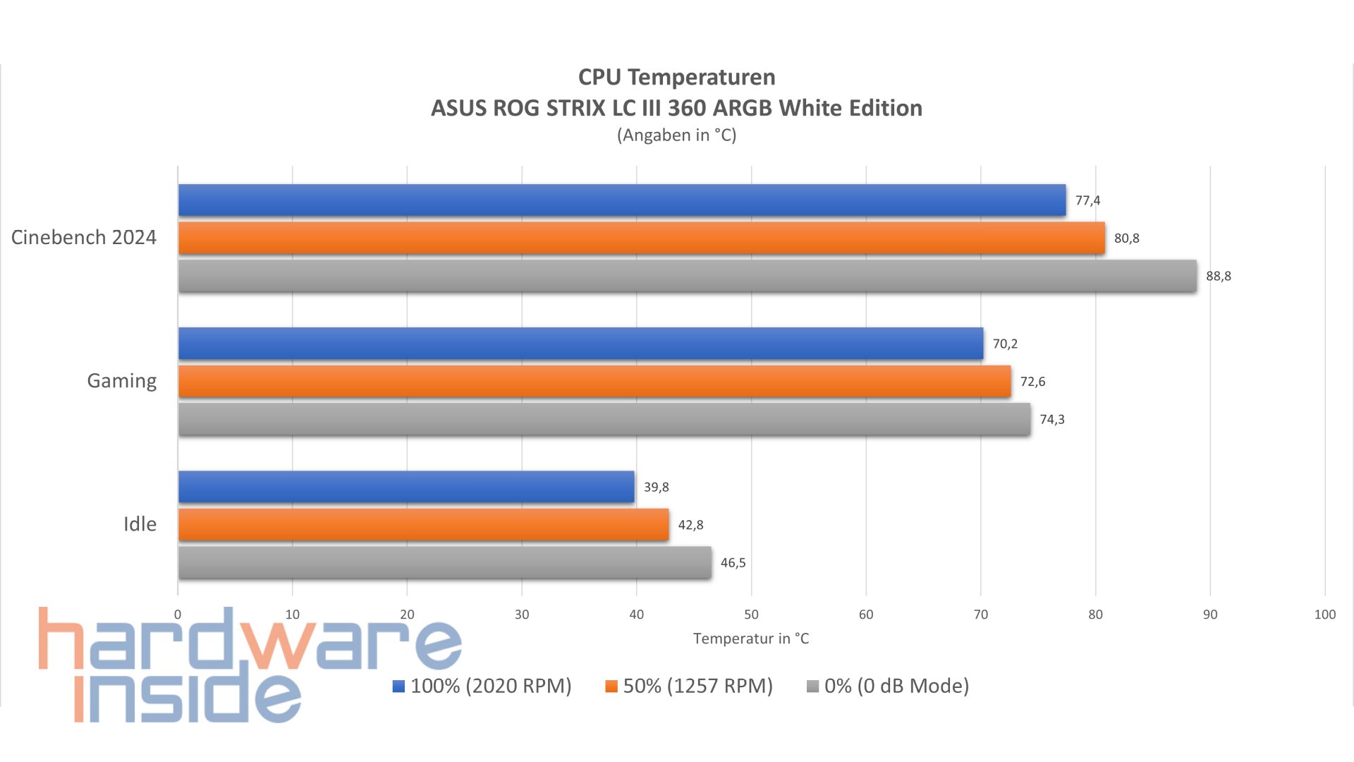 Wie macht sich die ASUS ROG STRIX LC III 360 ARGB? Unserer Meinung nach sehr gut. Mit der ab Werk mitgelieferten Wärmeleitpaste können sich die Werte sogar bei komplett abgeschalteten Lüftern sehen lassen. Benchmarks mit ausgeschalteten Lüftern würden wir nicht unbedingt empfehlen, aber zum Spielen und erst recht für den normalen Büroalltag können wir diese Art der Kühlung bedenkenlos verwenden. Die Pumpe ist bei konstanter Umdrehungszahl nicht zu hören, was sich gut mit dem 0dB-Modus ergänzt. Generell liegen unsere Temperaturen beim Spielen weit unter 80°C, auch beim Benchmarken kommen wir bei 50% Lüfterdrehzahl nur knapp darüber, was unterm Strich bedeutet, dass sowohl die Pumpe als auch die Kühlplatte super funktionieren.