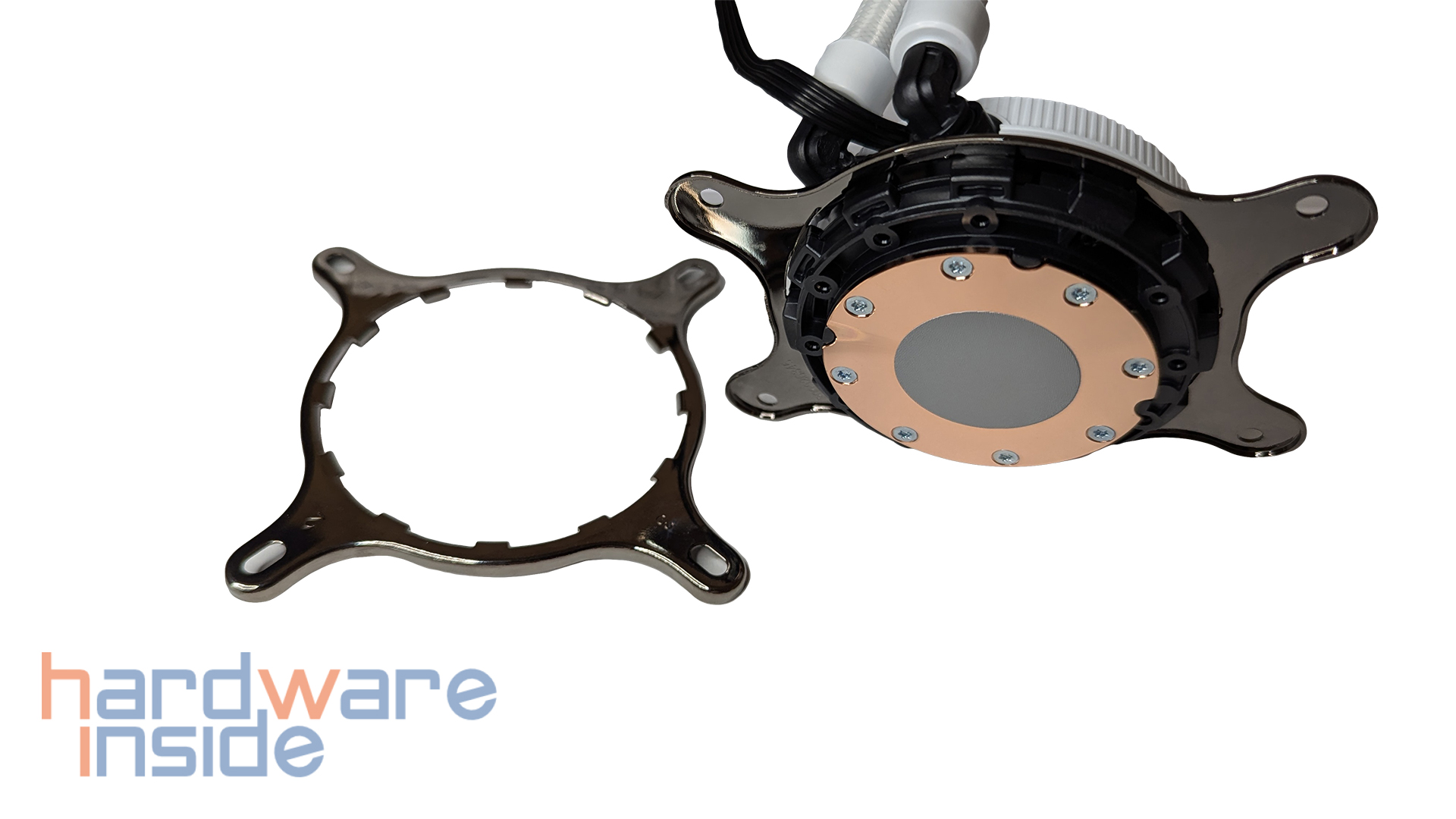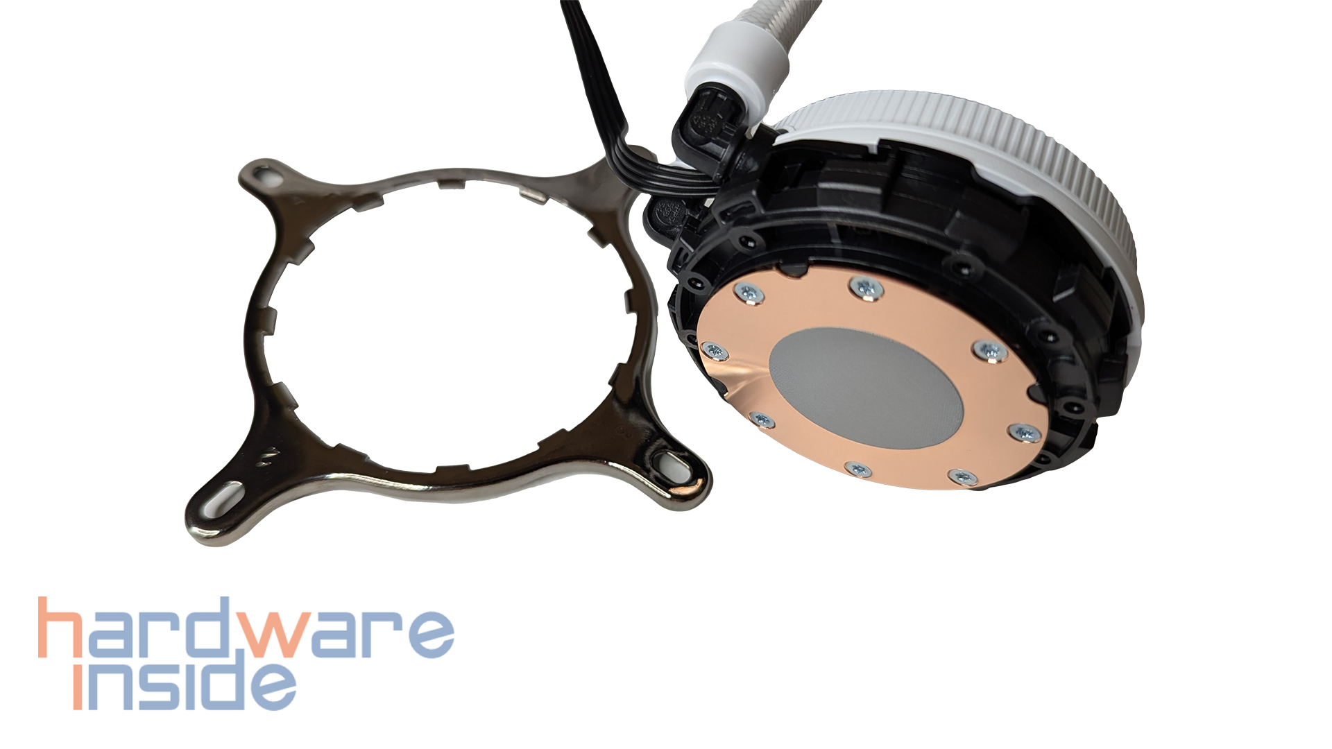 Passend zum Pumpengehäuse ist die Kühlplatte aus Kupfer rund ausgeführt. Eine Wärmeleitpaste ist bereits werkseitig aufgetragen. Eine Kunststoffabdeckung, die sowohl die Paste als auch das Kupfer vor Kratzern und Schmutz schützt, muss vor dem Einbau entfernt werden.