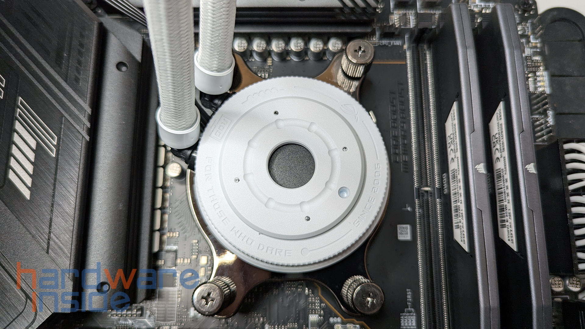 Der Deckel wird durch einen Magneten am Pumpengehäuse gehalten. Am Pumpengehäuse sieht man auch sehr gut die Einrastpunkte, die am Innenring durch kleine runde Aussparungen zu erkennen sind. Der Magnet selbst befindet sich jedoch in der Mitte, so dass wir den Deckel theoretisch um 360° drehen können. Das Pumpengehäuse hat unter dem Deckel sowie den Lüftern diverse Gimmicks eingelassen, wie den Schriftzug „FOR THOSE WHO DARE“ oder auch das ROG-Logo. Das ASUS ROG STRIX LC III 360 ARGB gibt es auch in einer LCD-Version, die anstelle unseres einfachen Deckels einen mit LCD-Bildschirm hat. Ob man die einzelnen Abdeckungen demnächst auch einzeln kaufen kann oder ob es noch weitere Varianten geben wird, wissen wir noch nicht.