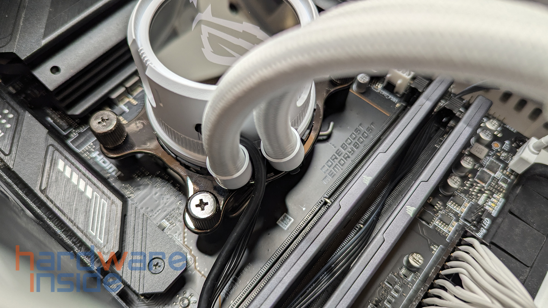 Der Radiator hat eine Dicke von 27 mm und ist damit recht schlank. Die ummantelten Gummischläuche haben eine Länge von 400 mm und erreichen damit gut die verschiedenen Stellen im Gehäuse. Der Radiator selbst hat zudem in seinem Aluminiumrahmen auf beiden Seiten das ROG-Logo eingelassen, so dass das Design der AIO durchgängig ist und wir an allen Ecken und Enden kleine Gimmicks finden. An den Schläuchen ist bereits ein Klettband zum Zusammenhalten der Schläuche angebracht.