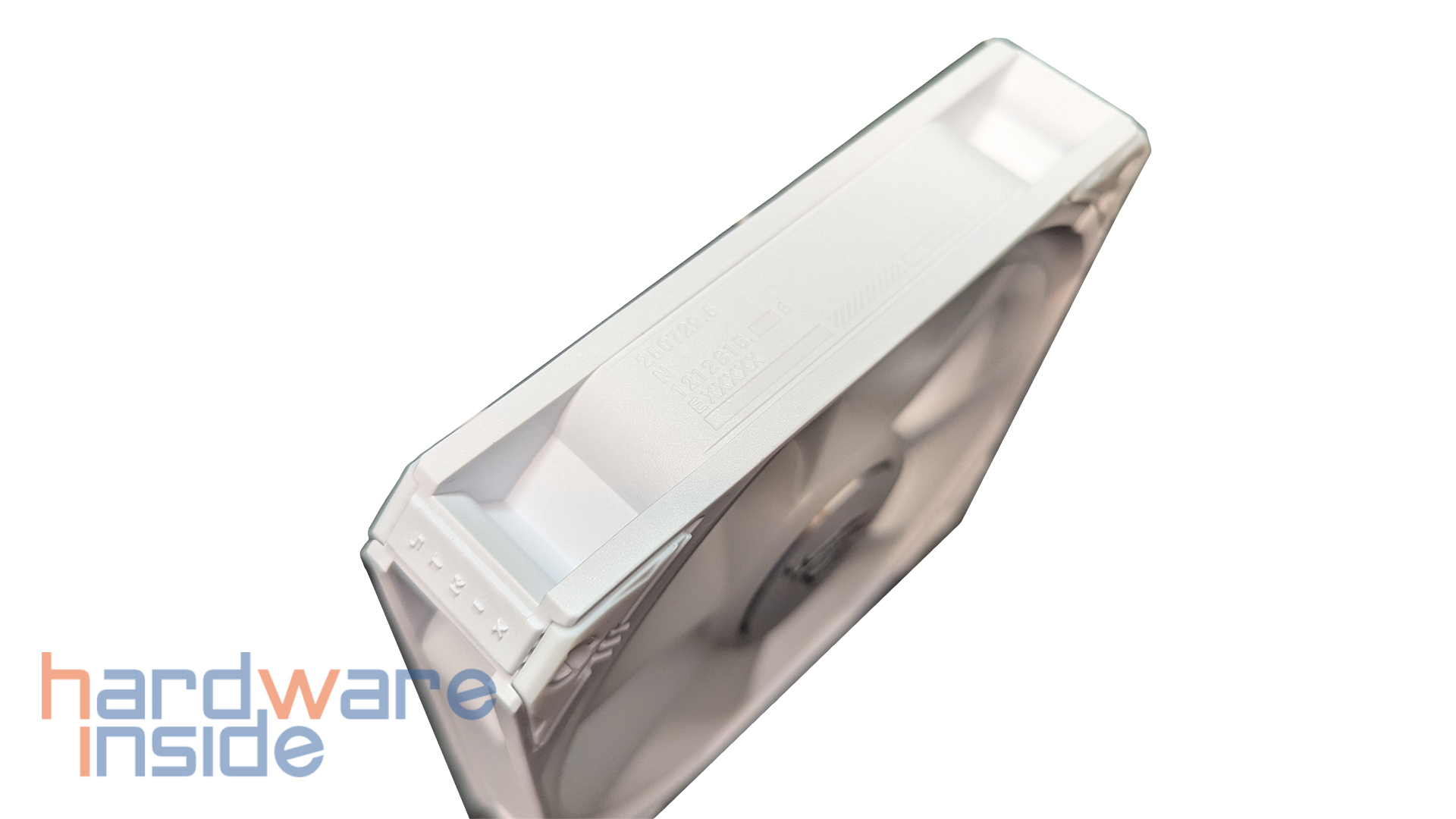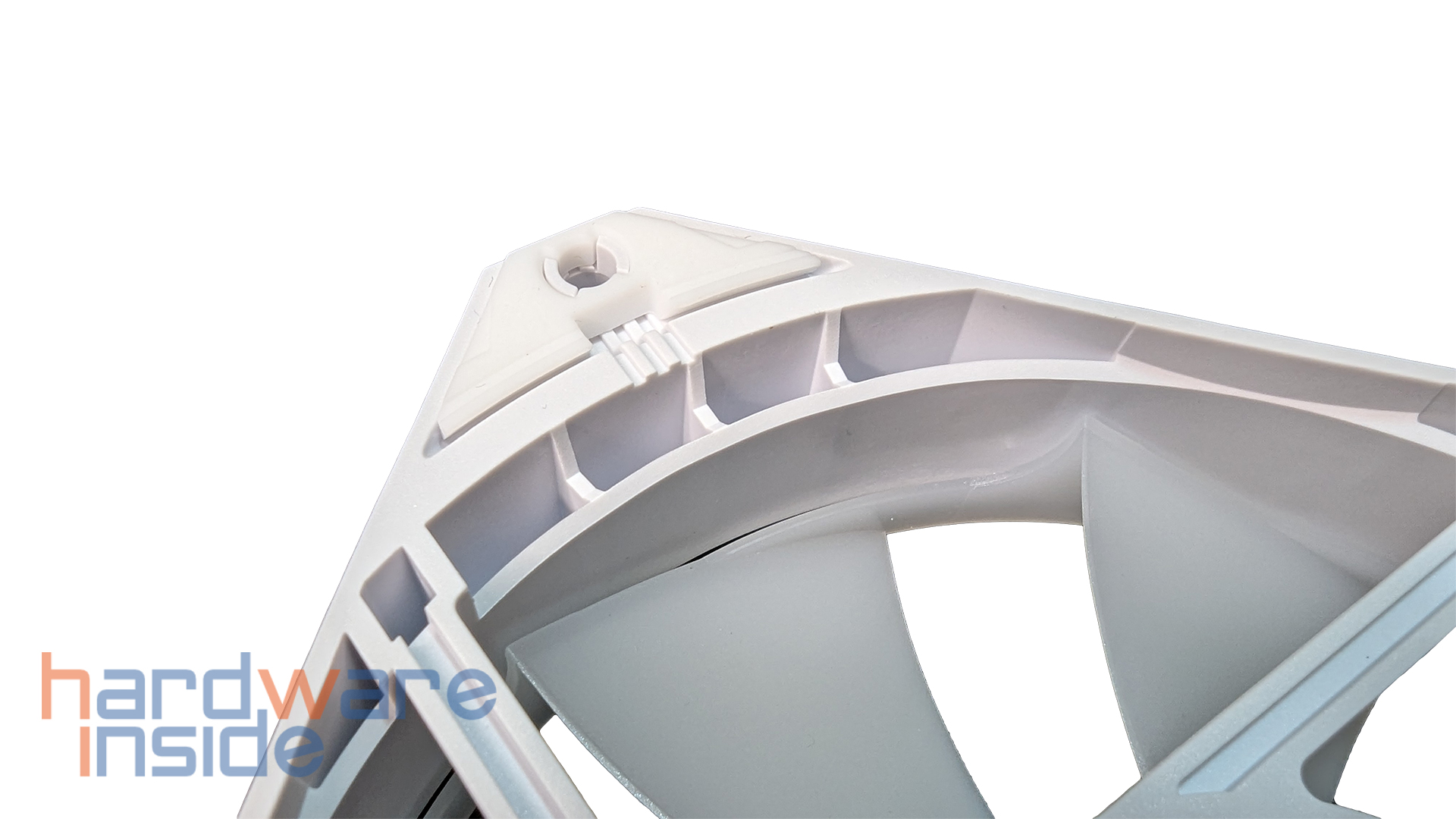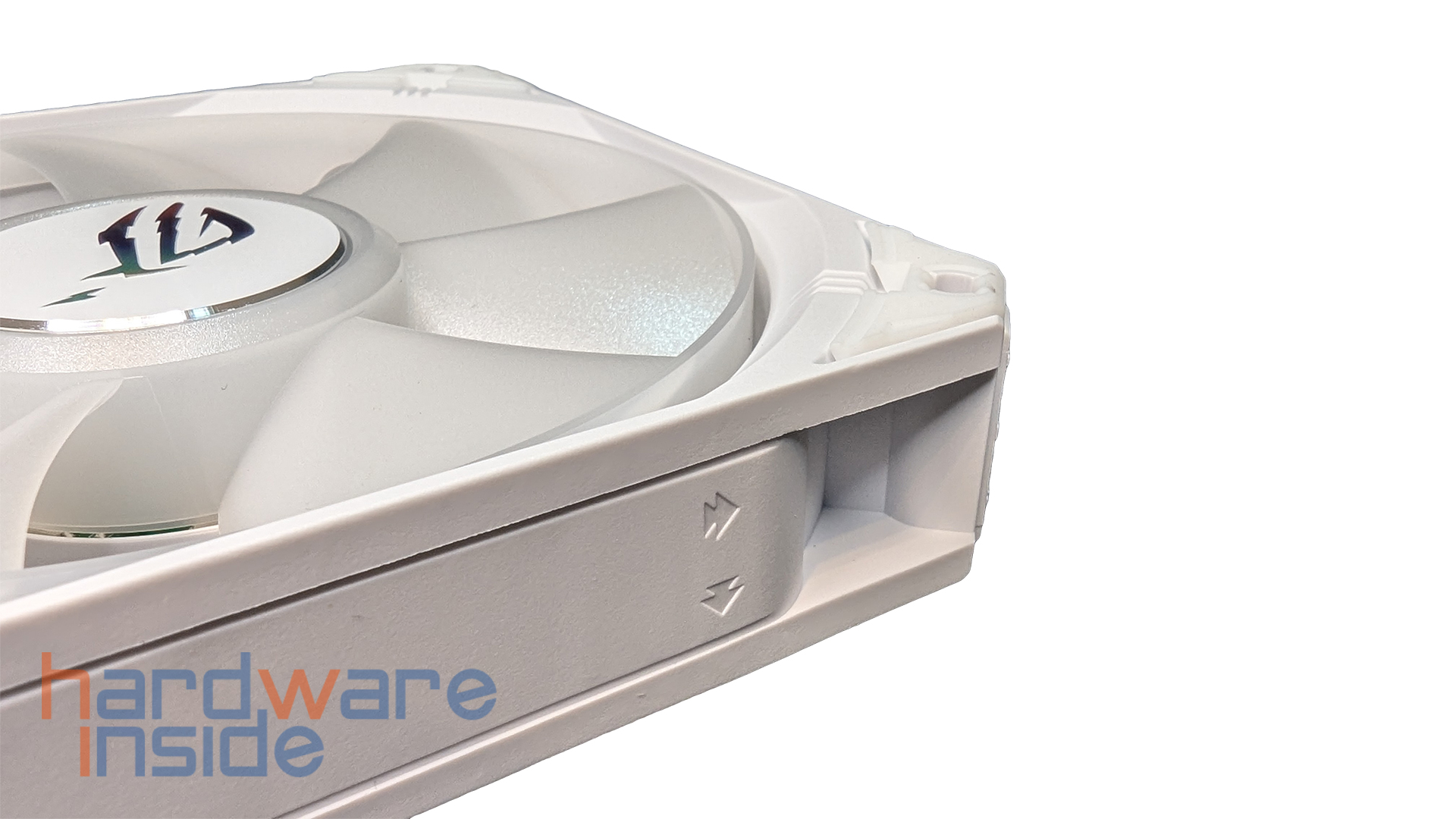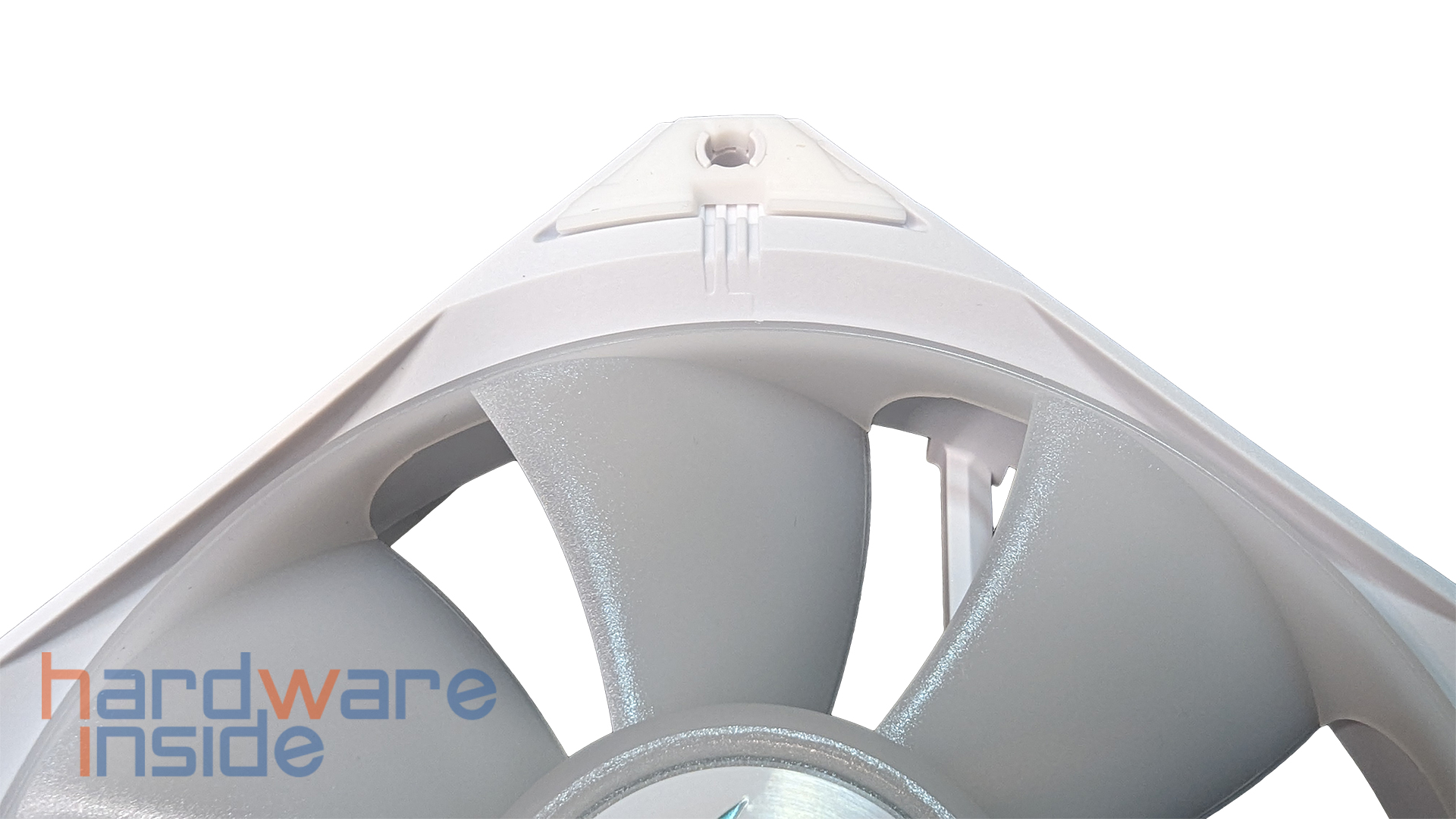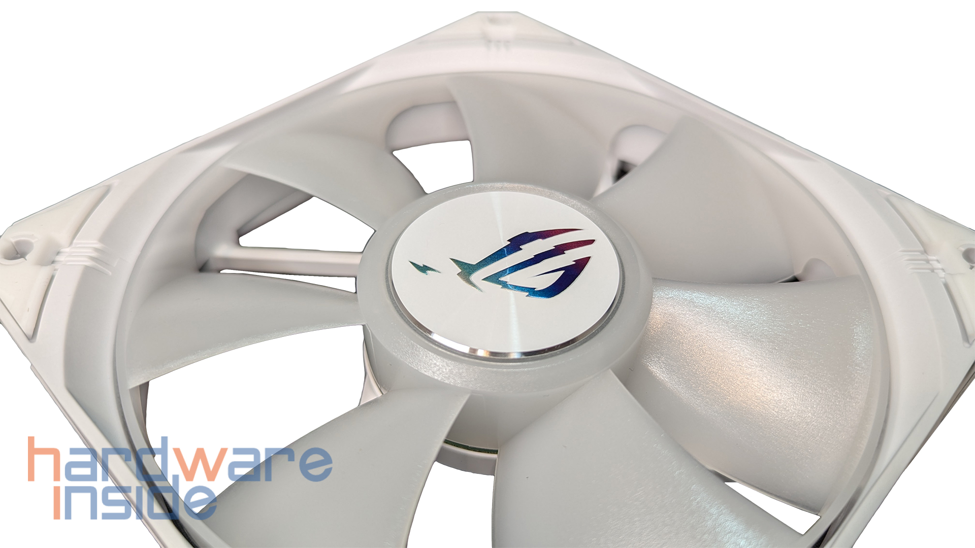 ASUS ROG verbaut die AF-12S ARGB Lüfter in mehreren seiner AIO Wasserkühlungen, so auch in der ASUS ROG Ryuo III, welche wir bereits getestet haben. Die Besonderheit hier ist, dass es sich um die ROG STRIX Variante der Lüfter handelt, bei der der wesentliche Unterschied im Design und weniger in der Leistung liegt. Passend zur White Edition der AIO sind die Lüfter sowie deren Kabel komplett in weiß gehalten. An allen Ecken sind Anti-Vibrations-Dämpfer angebracht, die zur Reduzierung von Vibrationen am Kühler und somit am Gehäuse beitragen. Die transparenten Lüfterblätter tragen in der Mitte ein ROG-Logo, das in sanften RGB-Farben reflektiert. Auf der Rückseite tragen vier Streben die Motorhalteplatte, auf der sich wiederum ein ROG-Logo sowie die Modellbezeichnung befindet.