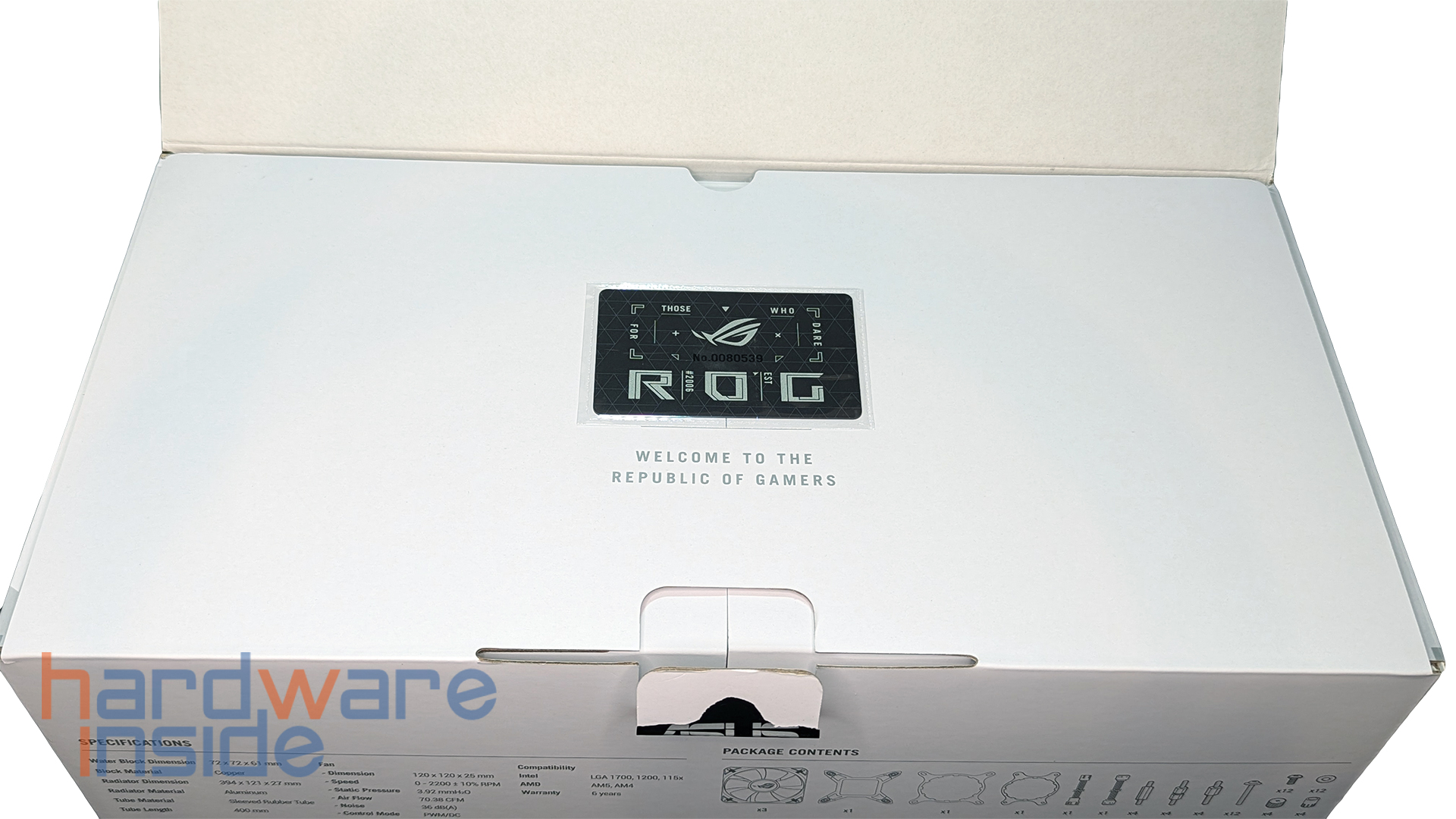 Die Verpackung ist passend zu unserem Design des ASUS ROG STRIX LC III 360 ARGB komplett in weiß gehalten. Auf der Vorderseite befindet sich ein Bild der Wasserkühlung, links oben das ROG-Logo, links unten die Bezeichnung der AIO. Unten rechts finden wir dann diverse Logos, wie die Zertifizierung durch Asetek und die kompatiblen Sockel. Direkt unter der Vorderseite haben wir eine Auflistung der Spezifikationen und des Inhalts. Drei weitere Features wie die Asetek Gen7 V2 Pumpe, der drehbare Pumpendeckel sowie die Lüfter sind auf der Seite oberhalb der Front abgebildet. Beim Öffnen der Verpackung begrüßt uns eine schwarze ROG-Karte mit unserer Seriennummer darauf. Direkt darunter steht „WELCOME TO THE REPUBLIC OF GAMERS“. Im Inneren der Verpackung ist alles sicher verstaut und in einzelne Bereiche unterteilt. So ist jeder Lüfter einzeln verpackt, die Kabel und Schrauben in einer eigenen Box und die Wasserkühlung selbst in einer eigenen Aussparung.