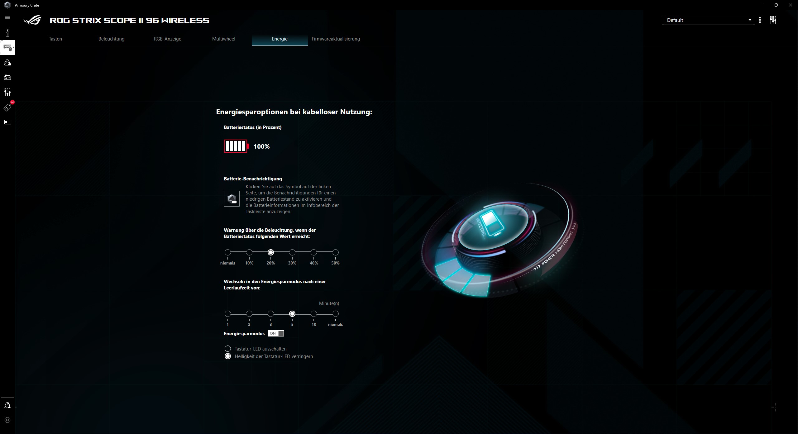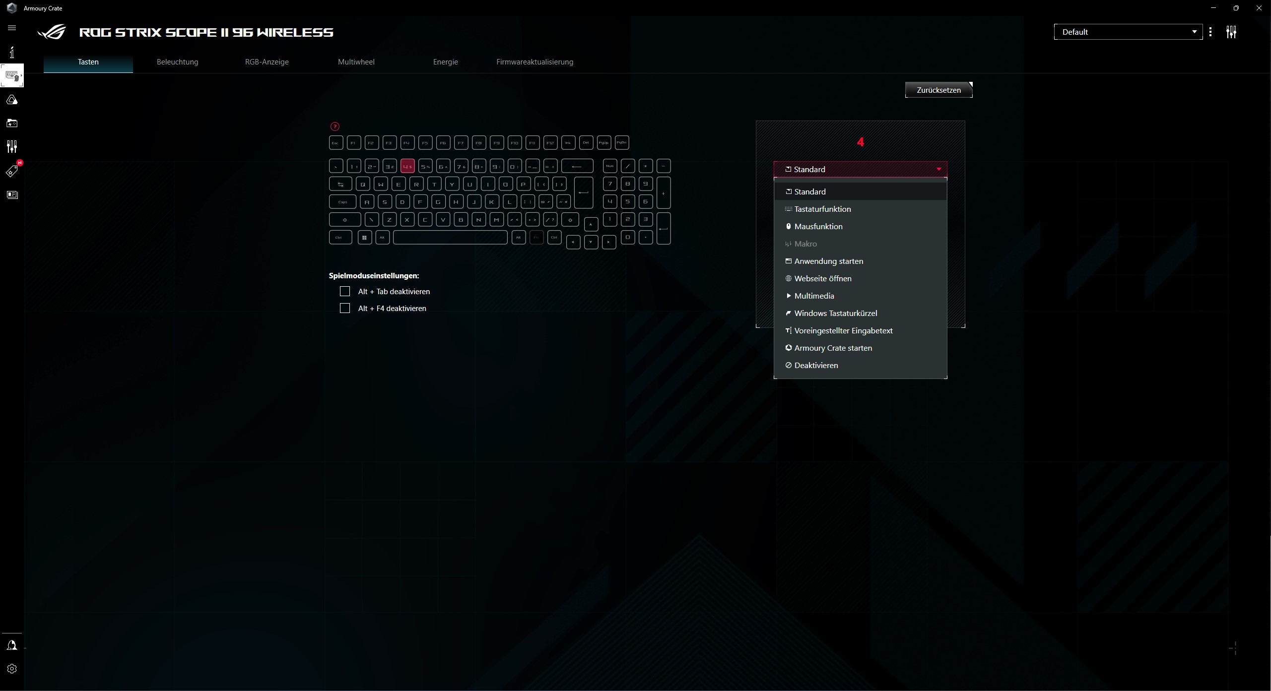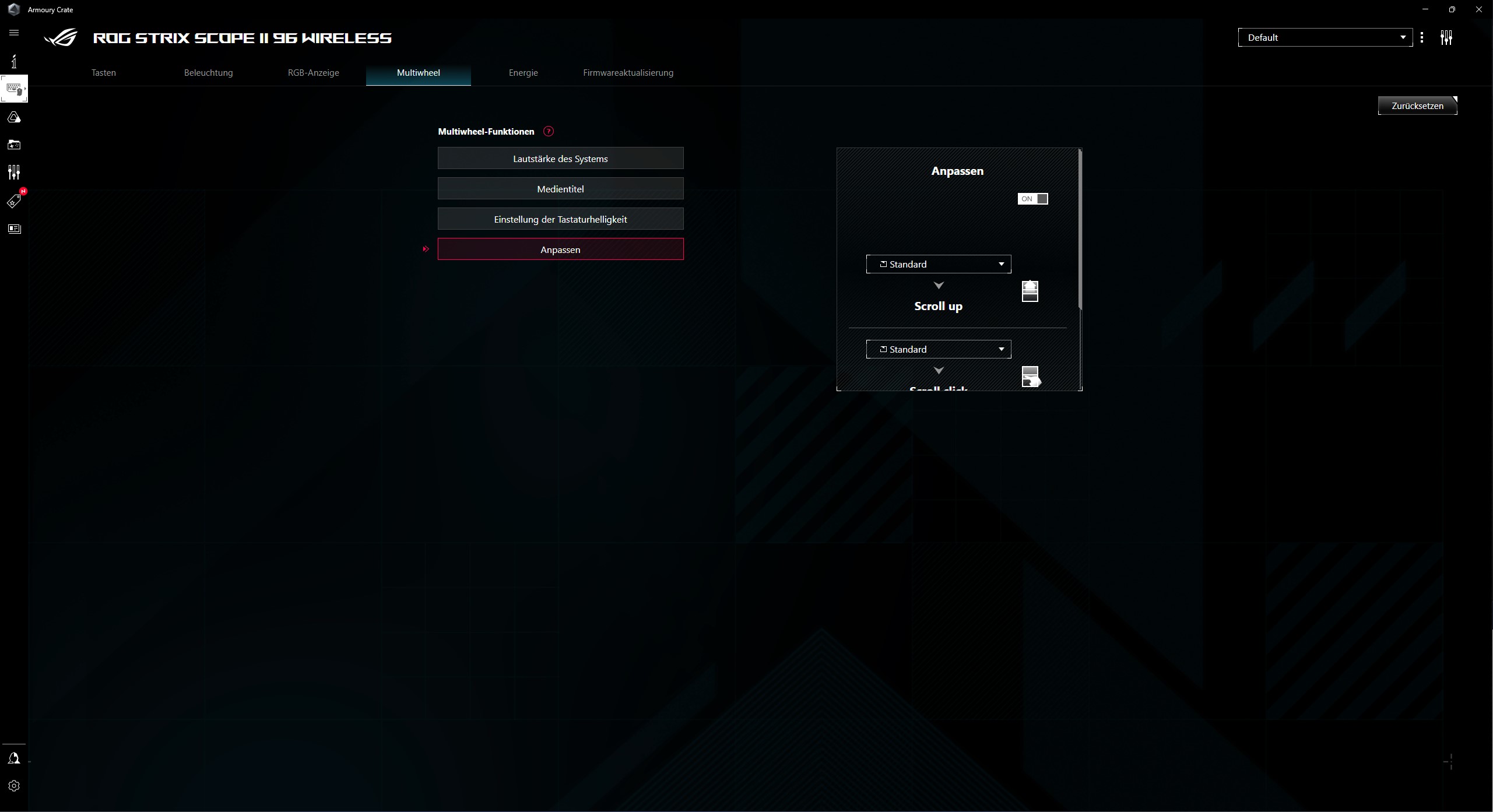 ASUS setzt bei allen Peripheriegeräten auf die Software „Armoury Crate“. Diese bietet in gewohnter Weise zahlreiche Einstellungsmöglichkeiten. So kann hier jeder Taste eine andere oder zusätzliche Funktion zugewiesen werden, die in Kombination mit der FN-Taste genutzt werden kann. Auch der vierte Modus der Multifunktionstaste oben rechts, die mit Hilfe des Multiwheels bis zu drei benutzerdefinierten Aktionen ausführen kann, lässt sich hier anpassen.