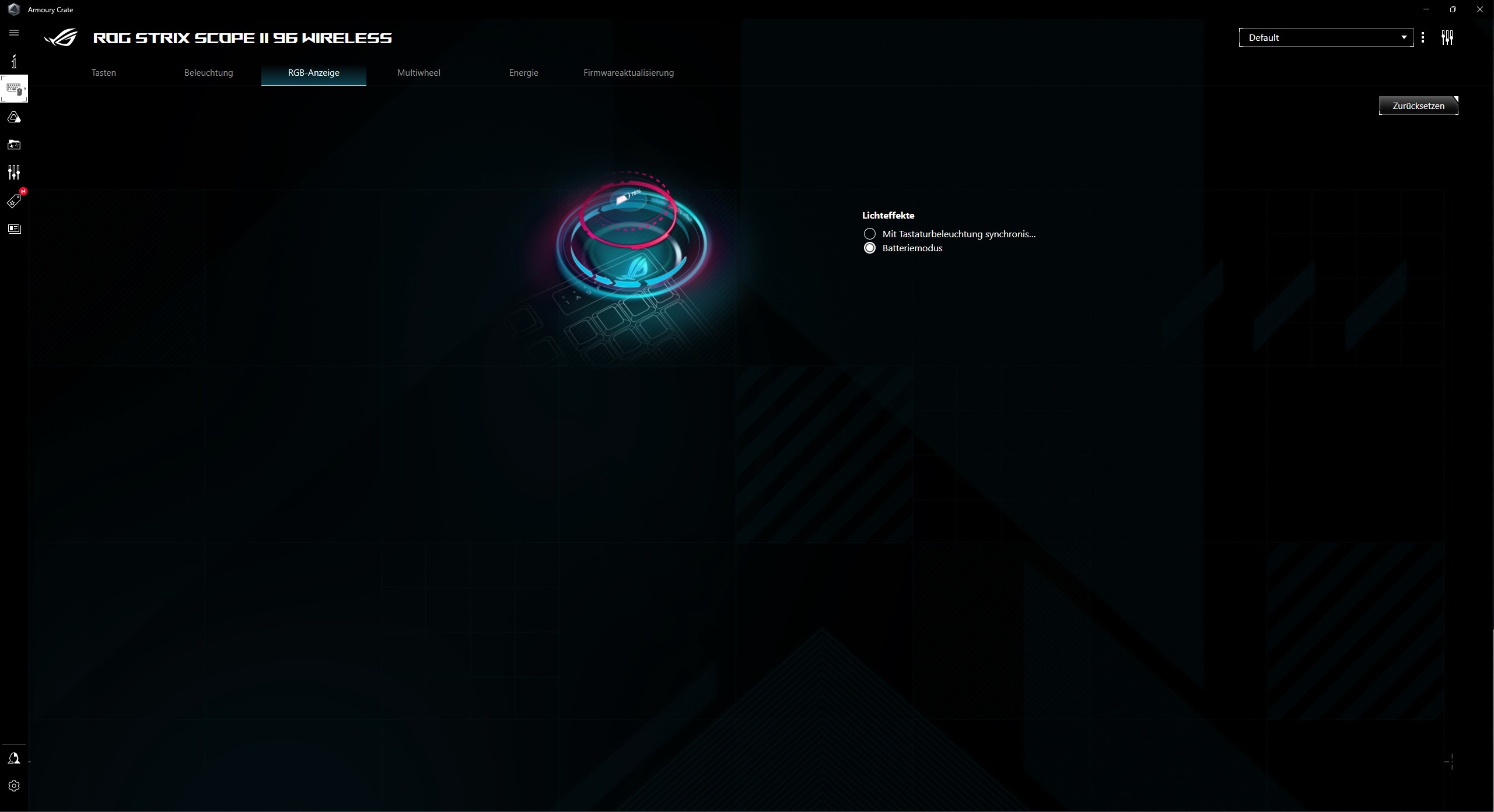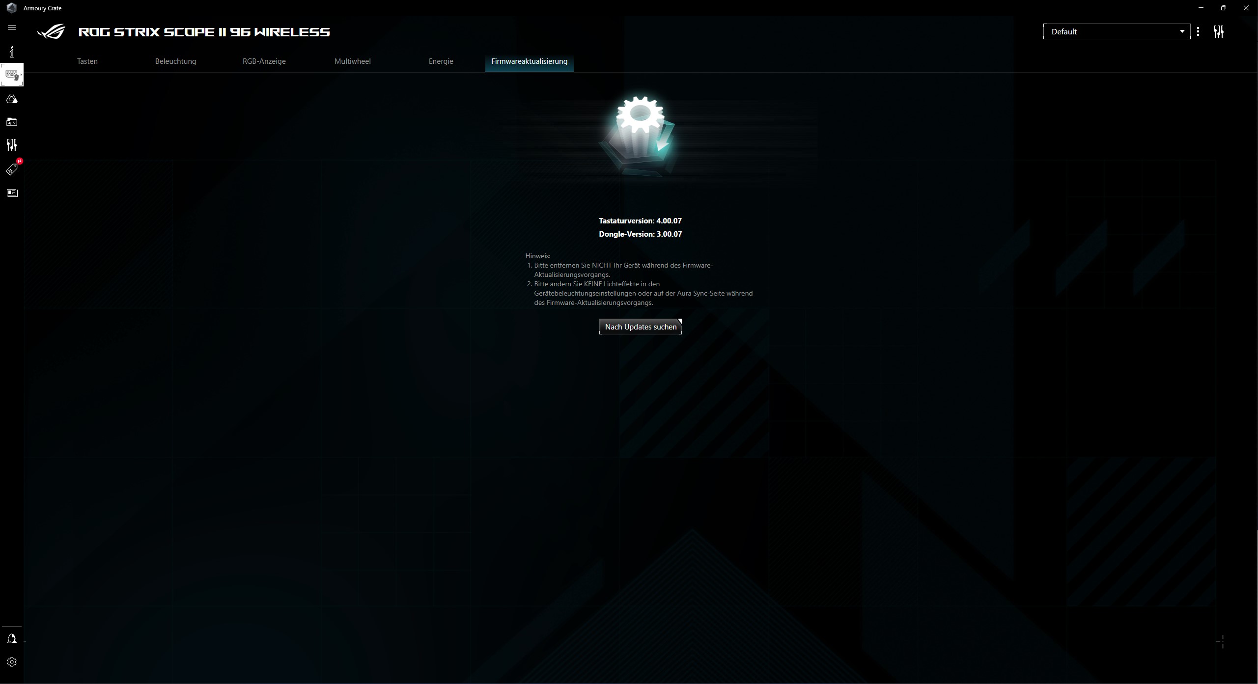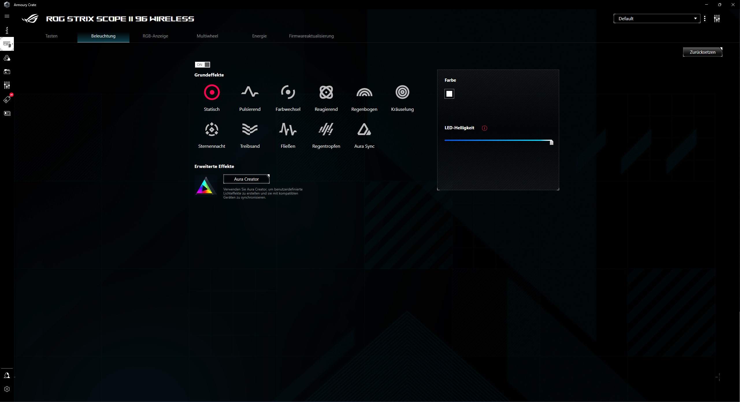 Bei der Beleuchtung bieten sich dem Nutzer ganze 11 Grundeffekte, die jeweils angepasst werden können. Pulsierende Farben, Regenbogen und statische Beleuchtung gehören dabei zum guten Ton. Möglich ist auch, jede Taste einzeln anzusteuern und anders zu beleuchten. Im letzten Reiter kann die Firmware mit wenigen Klicks aktualisiert werden, was hervorragend funktioniert hat. Die Tastatur lässt sich via Aura Sync mit dem restlichen Setup synchronisieren, vorausgesetzt man nutzt weitere Aura Sync fähige Geräte. Eine Auswahlmöglichkeit, was genau installiert wird, halten wir hier definitiv für angebracht, denn die Software kommt von Haus aus mit sehr vielen Funktionen, die für den ein oder anderen eher störend wirken kann.