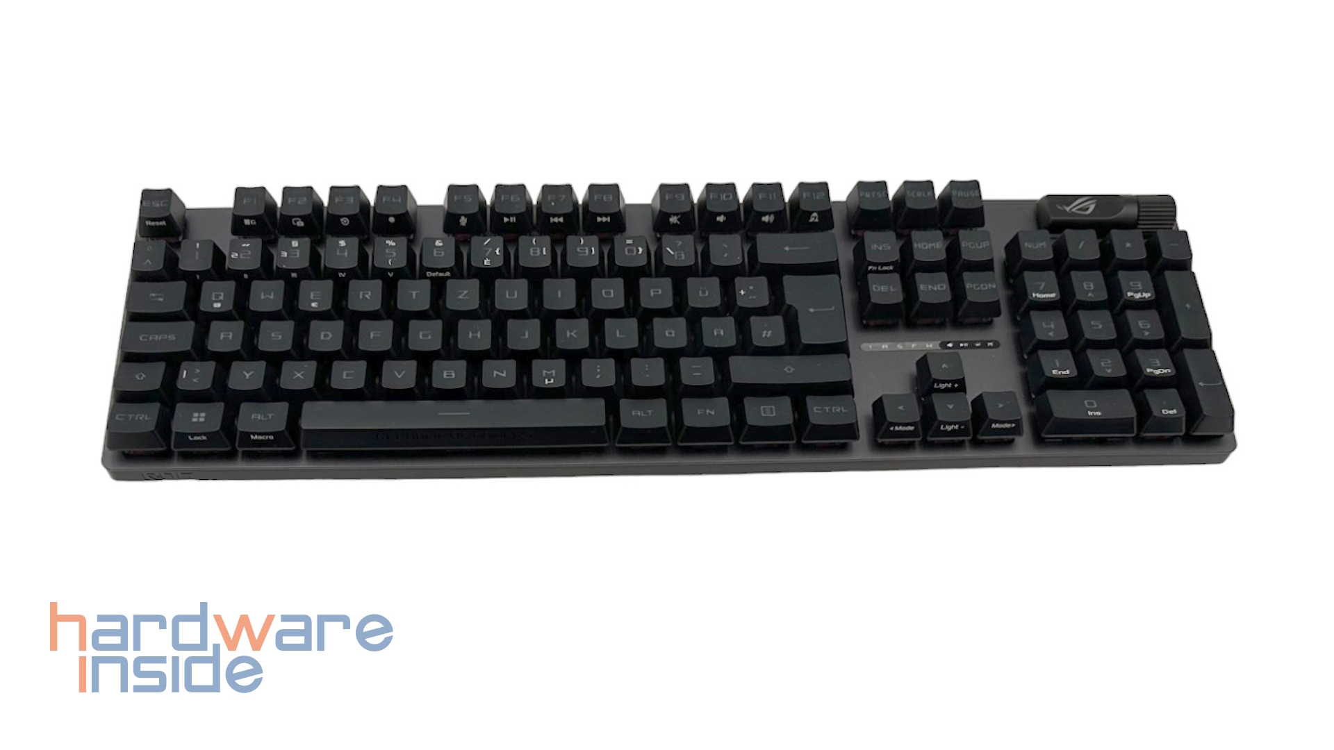 Bei der ASUS ROG STRIX SCOPE II RX handelt es sich um eine Tastatur mit vollständigem Layout. Auffällig ist die Taste oben rechts mit dem ROG-Logo und die danebenliegende Walze. Der Korpus besteht komplett aus Kunststoff, doch trotzdem bringt es die Tastatur mit 836 Gramm auf ein gutes Gewicht. Bei den Tastenkappen setzt ASUS hier auf PBT-Kunststoff, was wir sehr begrüßen. Dieser Kunststoff ist weniger anfällig, insbesondere bei ABS-Tastenkappen kommt es sehr schnell zu einem Glänzen an den meist genutzten Stellen, bei PBT-Tastenkappen ist dieser Effekt nicht so stark ausgeprägt. Die Beschriftung ist modern und gut ablesbar, Zusatzfunktionen sind meist seitlich auf den Tastenkappen aufgedruckt. Diese Funktionen heben sich farblich von der sonstigen Beschriftung ab, denn während die meisten Beschriftungen eher hellgrau sind, sind die Zusatzfunktionen in hellem weiß aufgebracht.