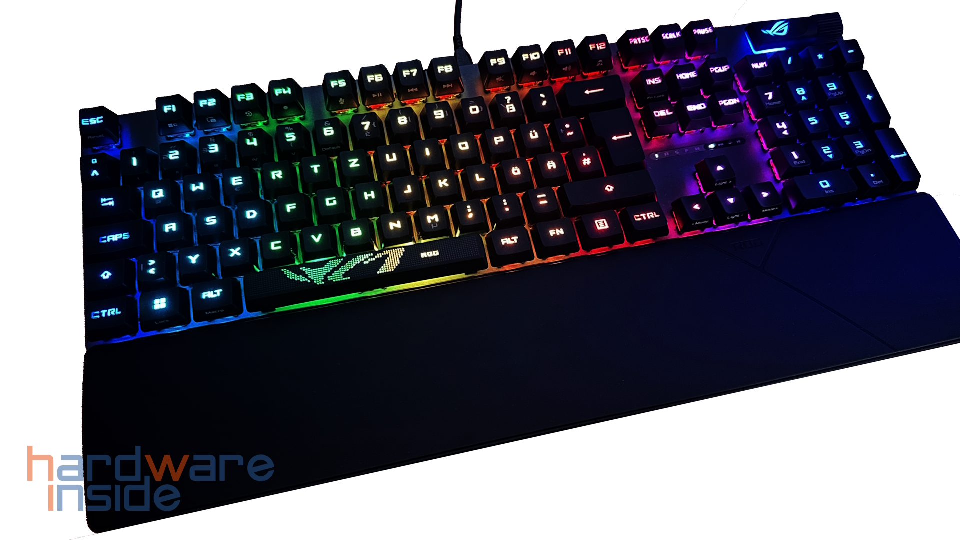 ASUS hat ein sehr informatives Video zu den Schaltern auf seinen Kanal, welches wir euch hier verlinken. Hier handelt es sich um die ROG-RX-Red Schalter, welche in ihrer Charakteristik in etwa den beliebten Cherry MX Schaltern entsprechen. Daher sollten wir hier eine lineare Charakteristik ohne hör- oder spürbares Feedback vorfinden. Der Auslösepunkt kommt nach 1,8 mm bei einer Betätigungskraft von 40 gf, der Gesamtweg liegt bei 4 mm. Die Besonderheit liegt im Aufbau, so ist die Feder im Inneren von einem kleinen Gehäuse nebst einer Scherenmechanik umgeben. Dieser Aufbau soll in der Praxis dafür sorgen, dass der Schalter wackelfrei betätigt werden kann. Zudem ermöglicht dieser Aufbau auch, dass die RGB-LED zur Beleuchtung nicht ober- oder unterhalb des Schalters liegt, sondern im Zentrum des Schalters. Das soll eine homogene Ausleuchtung der Tastenkappe ermöglichen.
