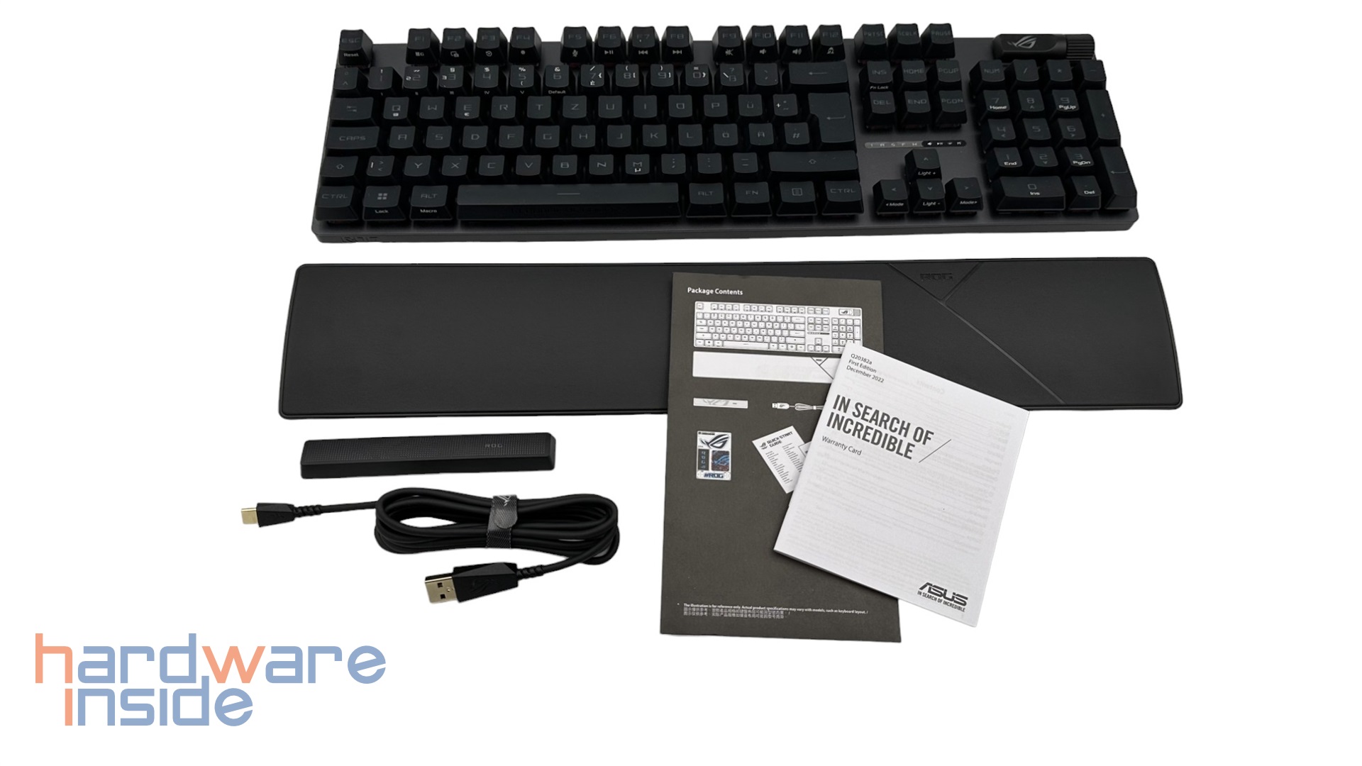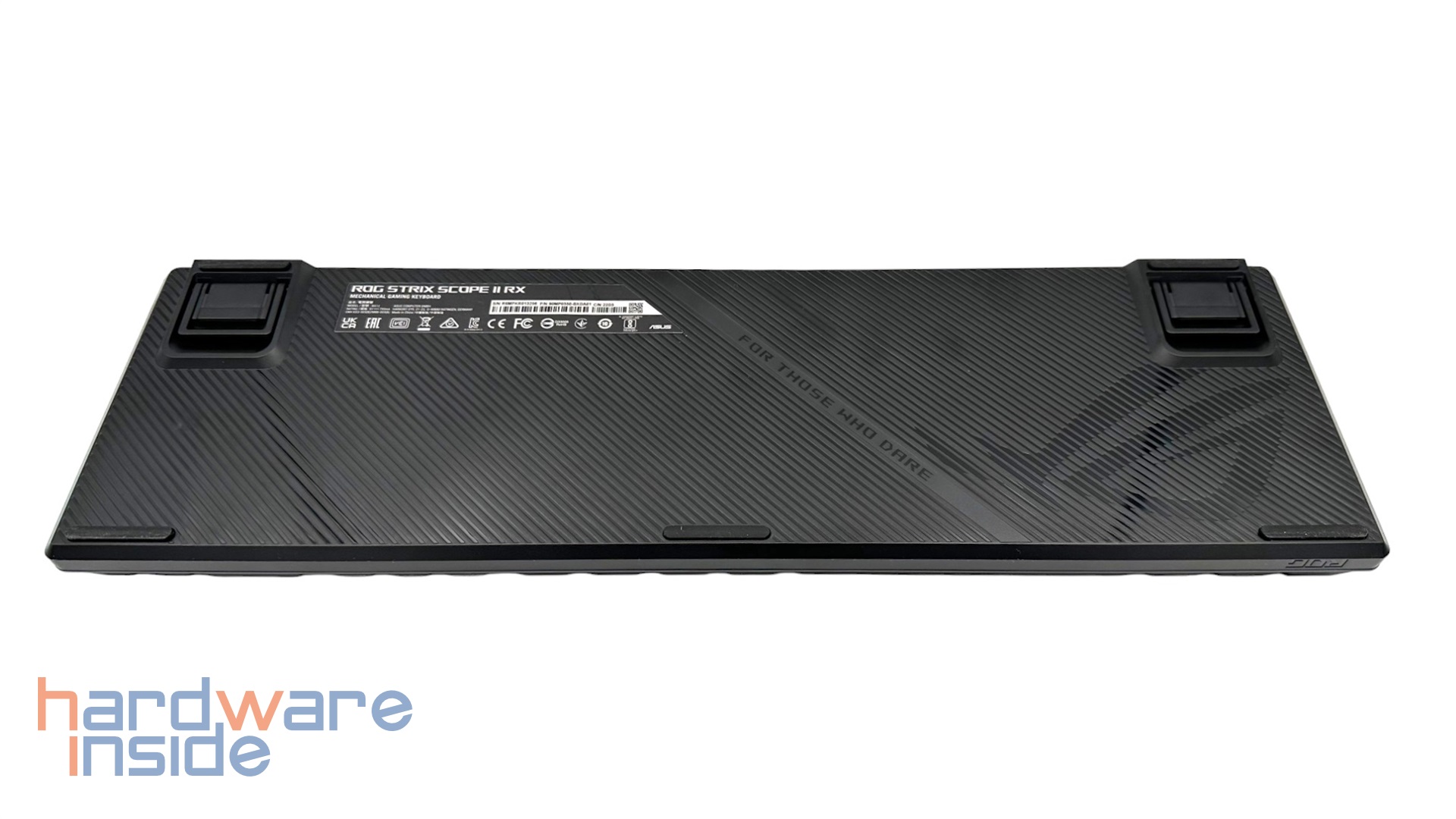An der Unterseite verfügt die Tastatur über ein Design aus diagonalen Streifen mit dem ROG-Logo und dem Slogan „FOR THOSE WHO DARE“. Zudem ist hier auch ein Aufkleber mit der Modellbezeichnung und einigen Informationen untergebracht. An der Vorderkante sorgen drei kleine Gummifüße für einen rutschfesten Stand. Dieser wird durch zwei weitere Gummifüße im hinteren Bereich ergänzt.