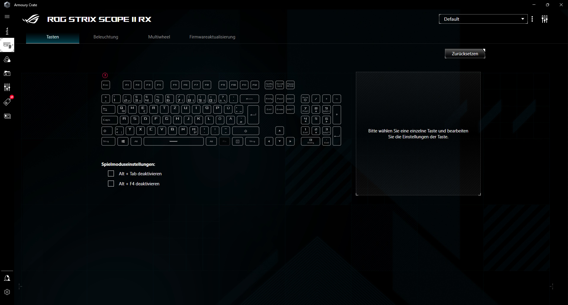 Grundsätzlich ist für die ASUS ROG STRIX SCOPE II RX keine Software notwendig. Möchte man jedoch die Beleuchtung noch mehr anpassen und Tastenfunktionen, Makros und dergleichen einrichten, wird man nicht um die Software Armoury Crate herumkommen. Auf der ersten Seite der Software können wir unter dem Menüpunkt der Tastatur einzelnen Tasten Funktionen oder Makros zuweisen.