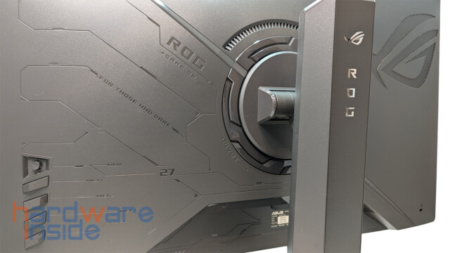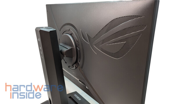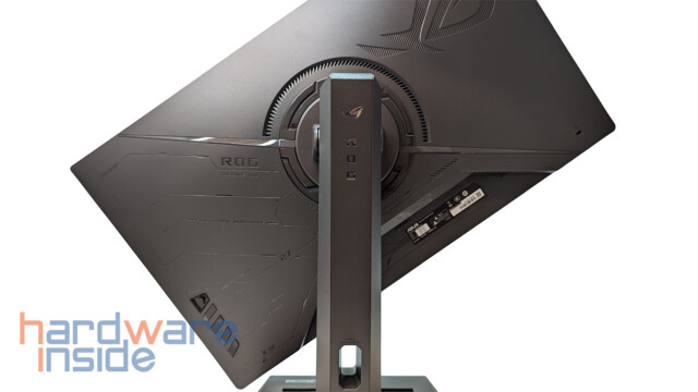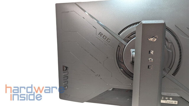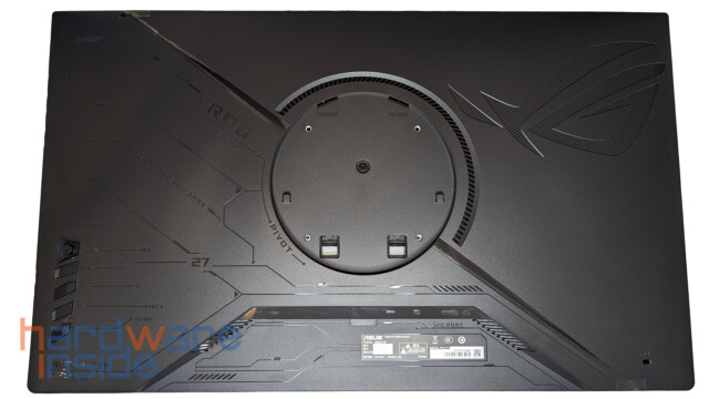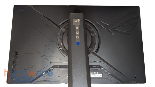 Dreht man den Monitor um, wird das typische Gaming-Design sichtbar. Der Monitorarm, auf dem sowohl das ROG-Logo als auch der ROG-Schriftzug zu sehen sind, ist eckig und hat am unteren Ende ein Loch für die Kabelführung. Am oberen Ende des Arms befindet sich ebenfalls ein Gewinde, um beispielsweise eine Halterung für Mikrofon, Kamera oder Licht anzubringen. Auf dem Monitor selbst ist in der rechten oberen Ecke noch einmal das ROG-Logo eingelassen. Am unteren linken Ende sind verschiedene Designelemente sowie Schriftzüge eingelassen, wie z.B. „GAME ON“ unter dem ROG-Schriftzug oder „PIVOT“ um die Halterung des Monitorarms.