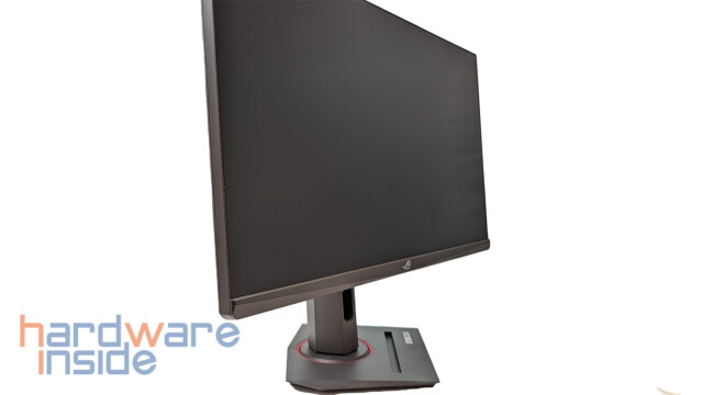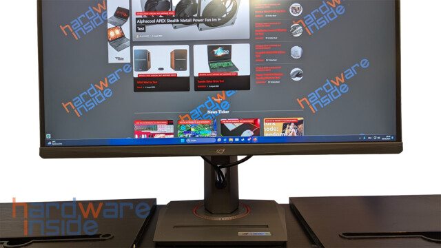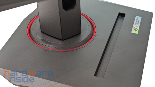 Der Standfuß bietet neben dem eckigen Design weitere kleine Designelemente, die dem Monitor insgesamt eine gewisse Note verleihen. Auffällig sind das ROG-Logo und der ROG-Schriftzug, die in Regenbogenfarben reflektieren. Direkt darüber befindet sich eine Vertiefung, in die wir zum Beispiel unser Smartphone legen können. Hier muss man allerdings den Monitor entsprechend in der Höhe verstellen, da sich die Mulde direkt unter dem Rahmen befindet. An dem Sockel, an dem der Monitorarm befestigt ist, finden wir ein rotes Designelement und verschiedene Einlässe, an denen wir sehen können, wie weit wir den Monitor gedreht haben. Das ist sehr hilfreich, wenn man den Monitor ganz gerade ausrichten möchte oder wenn man den Monitor öfter verstellt, um ihn wieder in die Ausgangsposition zu bringen.