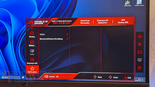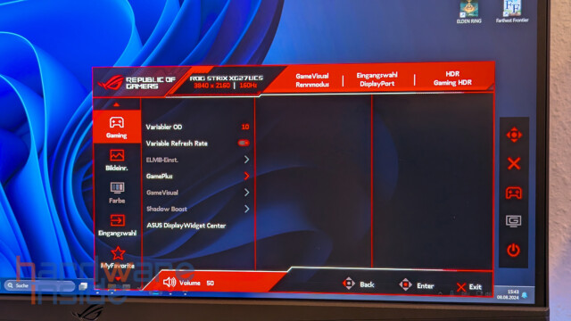 Das OSD kann über eine der drei Tasten oder den Navistick geöffnet werden. Die Bedienung des OSD erfolgt dann ausschließlich über den Navistick. Ein Klick auf den Stick öffnet das Hauptmenü, in dem wir dann durch die verschiedenen Unterpunkte navigieren können. Hier können wir fast alles einstellen, was mit dem Monitor zu tun hat. Wenn HDR aktiviert ist, ist das Menü „Farbe“ ausgegraut. Andere Einstellungen haben mit der Bildwiederholrate oder einer Kombination aus beiden zu tun. Informationen zu einzelnen Optionen, wie z.B. ELMB, sind nicht direkt im Menü zu finden, sondern müssen im Handbuch nachgelesen werden, das auf der Produktseite heruntergeladen werden kann. Ein interessantes Feature ist der Punkt „GamePlus“, unter dem wir einen FPS-Zähler, ein Fadenkreuz oder einen Timer starten können. Das OSD selbst ist recht aufgeräumt und die Navigation ist einfach. Eine weitere Option ist das ASUS DisplayWidget Center, mit dem das OSD auch per Maus gesteuert werden kann.