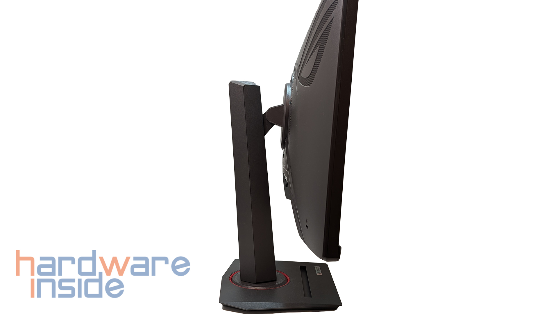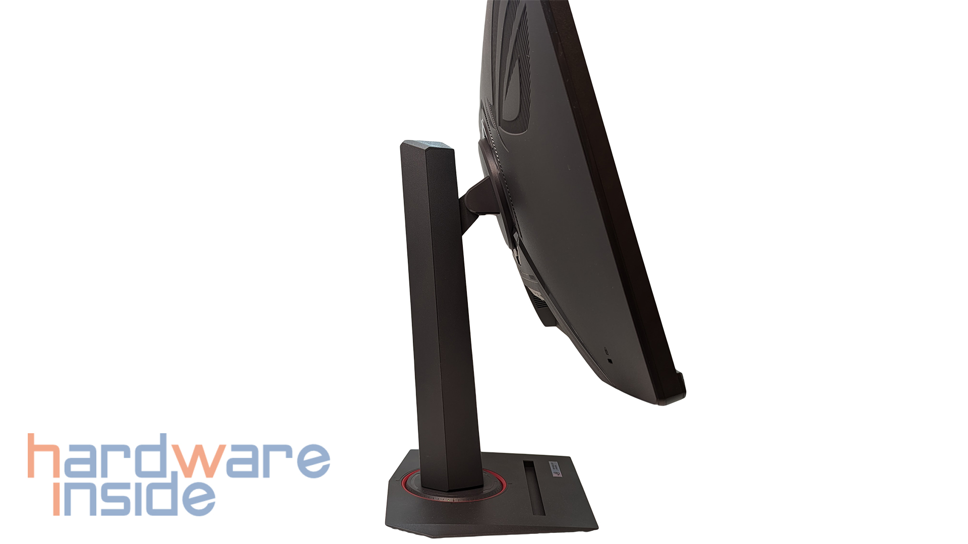 Der Standfuß bietet neben dem eckigen Design weitere kleine Designelemente, die dem Monitor insgesamt eine gewisse Note verleihen. Auffällig sind das ROG-Logo und der ROG-Schriftzug, die in Regenbogenfarben reflektieren. Direkt darüber befindet sich eine Vertiefung, in die wir zum Beispiel unser Smartphone legen können. Hier muss man allerdings den Monitor entsprechend in der Höhe verstellen, da sich die Mulde direkt unter dem Rahmen befindet. An dem Sockel, an dem der Monitorarm befestigt ist, finden wir ein rotes Designelement und verschiedene Einlässe, an denen wir sehen können, wie weit wir den Monitor gedreht haben. Das ist sehr hilfreich, wenn man den Monitor ganz gerade ausrichten möchte oder wenn man den Monitor öfter verstellt, um ihn wieder in die Ausgangsposition zu bringen.