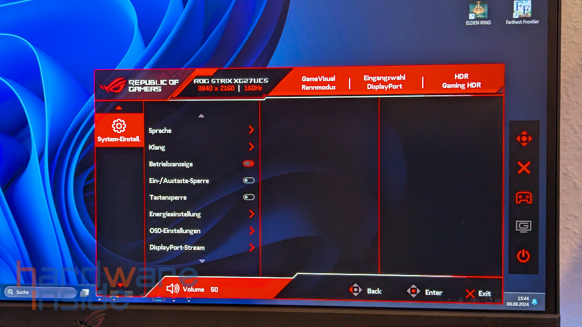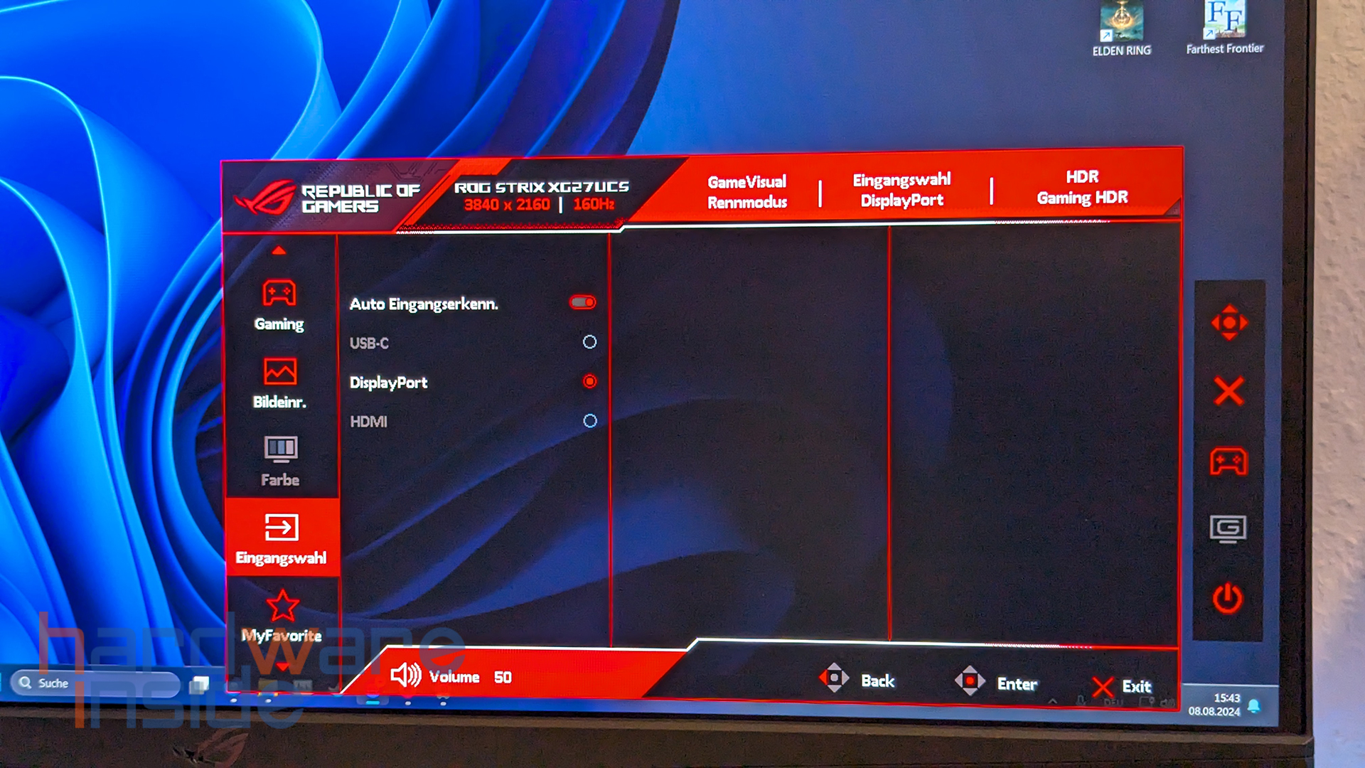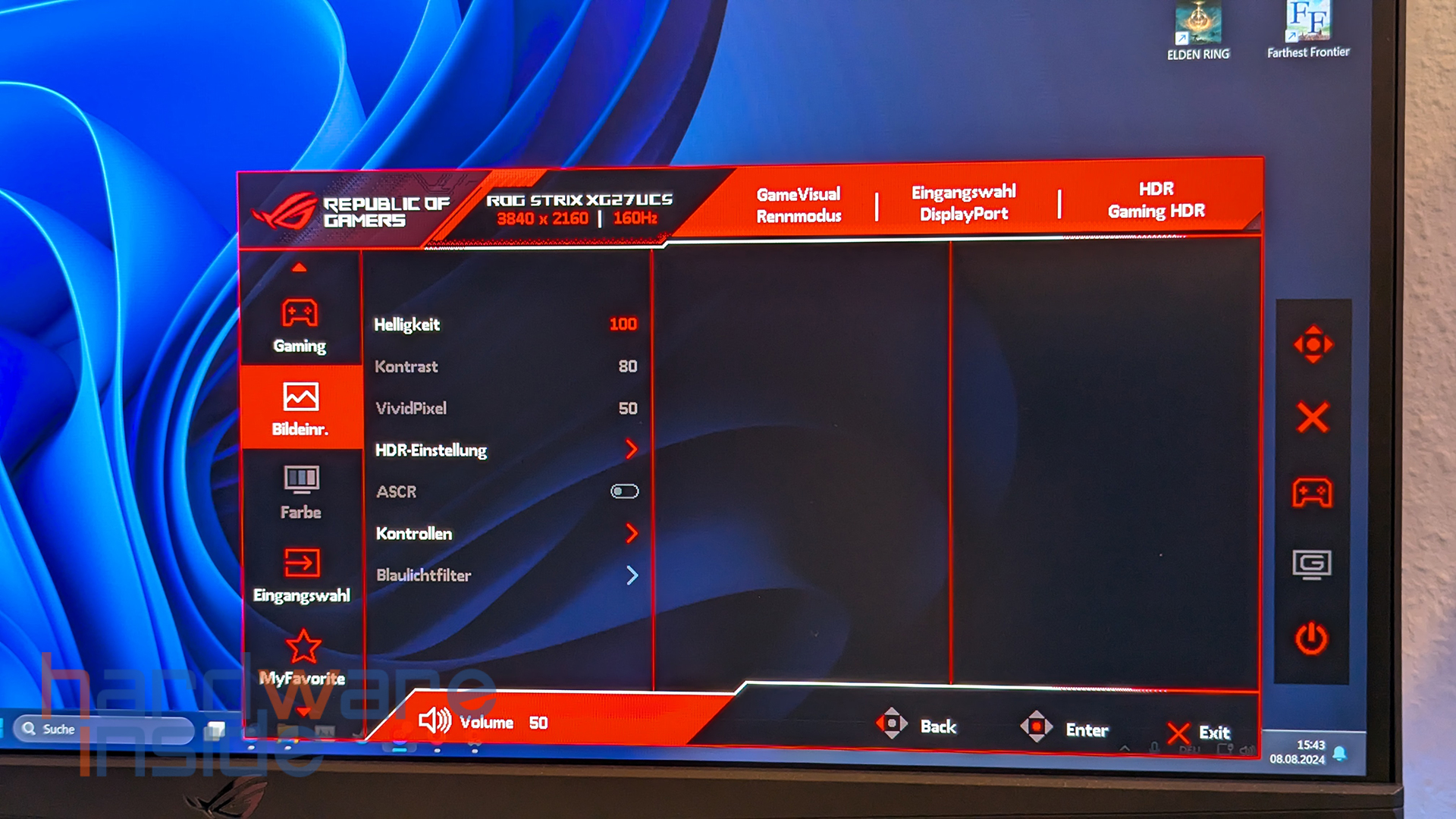 Um die Leistung des ASUS ROG Strix XG27UCS zu beurteilen, starten wir eine Runde Elden Ring. Zuvor ändern wir noch einige Einstellungen wie die Aktivierung von HDR und stellen die Bildwiederholrate auf 160 Hz ein. Und schon die ersten Areale überzeugen auf ganzer Linie durch die gute Farbdarstellung. Obwohl das Spiel recht dunkel ist, kommen die helleren Bereiche besonders gut zur Geltung. Lichtquellen und Reflexionen stechen hervor und verleihen der Szene Tiefe und Lebendigkeit, während die detailreichen Schatten in den dunkleren Bereichen die Atmosphäre perfekt ergänzen. So entsteht ein ausgewogenes Bild, das sowohl in den hellen als auch in den dunklen Passagen überzeugt. Leider ist es unserer Kamera nicht möglich, die genaue Farbdarstellung einzufangen, weshalb das obere Bild nicht ganz der Realität entspricht.