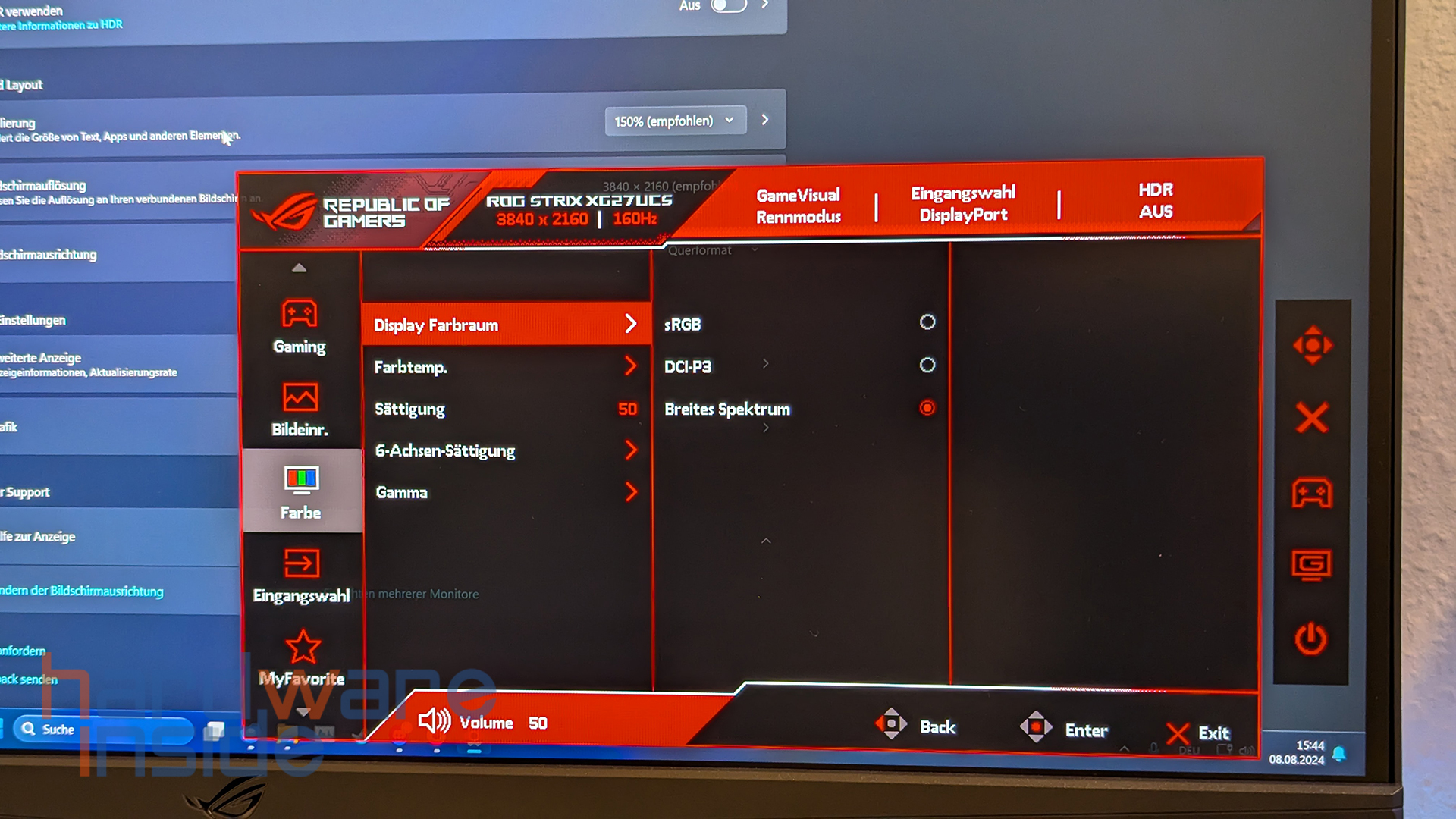 Auch beim Test mit Testbildern schneidet der Monitor sehr gut ab. Kreise sind perfekt rund, Linien klar erkennbar und auch bei viel Text ist alles gut lesbar. Ab Werk deckt der Monitor 95 Prozent des DCI-P3- und 130 Prozent des sRGB-Farbraums ab, was für satte Farben sorgt. Mit einer Helligkeit von 400 nits bietet der Monitor genügend Leuchtkraft, um sowohl beim Spielen als auch bei der Bildbearbeitung eine klare und lebendige Darstellung zu gewährleisten. Dank des IPS-Panels ist die Bildstabilität generell sehr gut. Dreht man den Monitor allerdings um 45°, wird das Bild etwas blasser. Da dies aber nicht die Regel ist, fällt dies nicht wirklich negativ auf. Alles in allem bietet das ASUS ROG Strix XG27UCS ein hervorragendes visuelles Erlebnis.