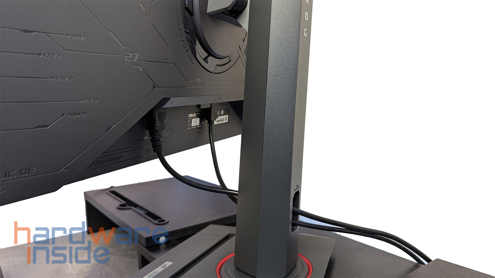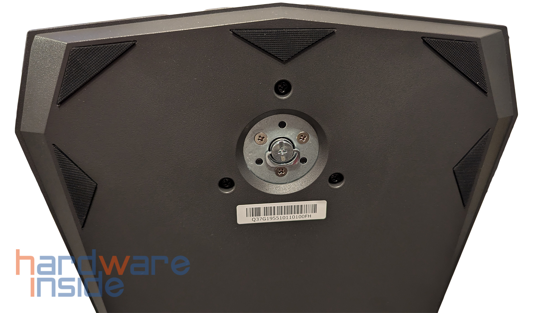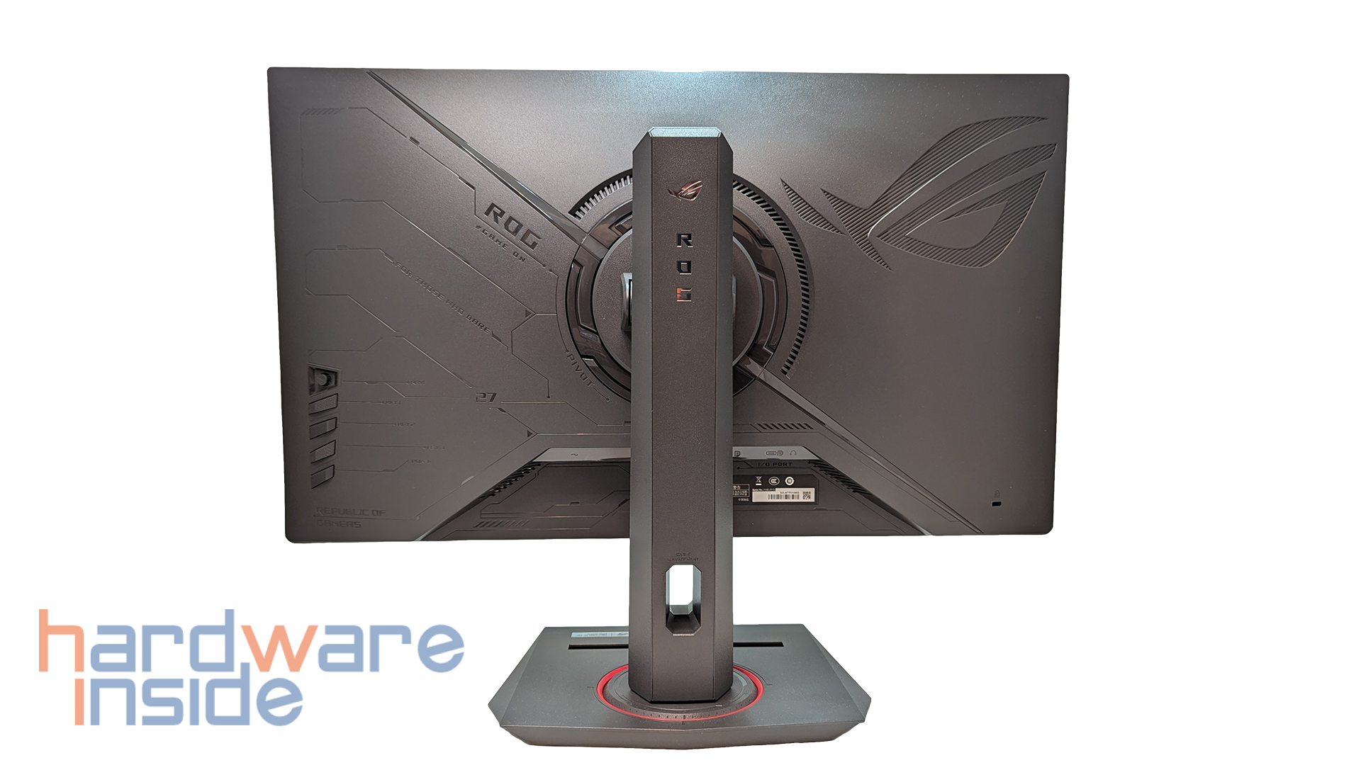 Dreht man den Monitor um, wird das typische Gaming-Design sichtbar. Der Monitorarm, auf dem sowohl das ROG-Logo als auch der ROG-Schriftzug zu sehen sind, ist eckig und hat am unteren Ende ein Loch für die Kabelführung. Am oberen Ende des Arms befindet sich ebenfalls ein Gewinde, um beispielsweise eine Halterung für Mikrofon, Kamera oder Licht anzubringen. Auf dem Monitor selbst ist in der rechten oberen Ecke noch einmal das ROG-Logo eingelassen. Am unteren linken Ende sind verschiedene Designelemente sowie Schriftzüge eingelassen, wie z.B. „GAME ON“ unter dem ROG-Schriftzug oder „PIVOT“ um die Halterung des Monitorarms.