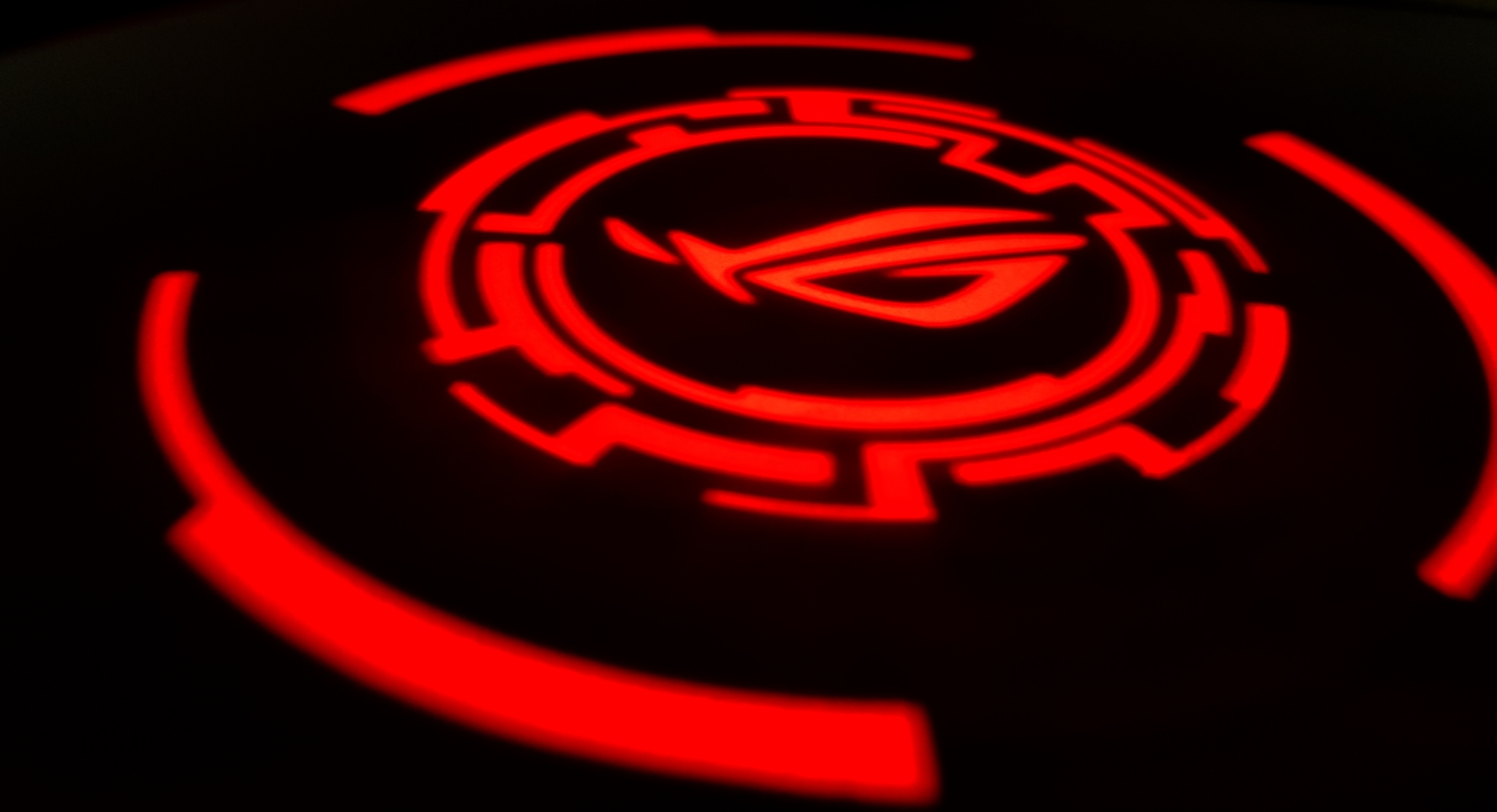 Der Zusammenbau des ASUS ROG Strix XG27VQ ist sehr einfach, es muss nur der Stand Fuß mit dem Halte Arm verbunden werden. Die Schraube dafür lässt sich von Hand festziehen. Der Stand Fuß verfügt über eine Ausleuchtung, wobei der Nutzer zwischen drei Schablonen auswählen kann. Zwei der Schablonen sind mit ROG Designs versehen, die dritter ist komplett blank und kann für ein eigenes Design graviert werden. Wir legen die Scheibe ein und arretieren das Ganze mit dem schwarzen Kunststoff Ring gemäß den darauf abgebildeten Pfeilen.