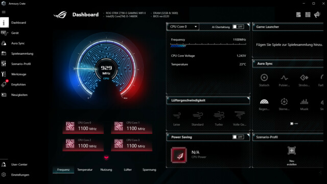 Armory Crate bietet eine benutzerfreundliche Oberfläche, die es dem Benutzer ermöglicht, verschiedene Aspekte des Systems zu optimieren und anzupassen. Die Software ermöglicht nicht nur den Zugriff auf Hardwareinformationen, sondern auch die Anpassung der Einstellungen für andere ASUS-Komponenten. Dazu gehören die Steuerung von Lüftergeschwindigkeiten, RGB-Beleuchtungseffekten und Übertaktungsoptionen für eine optimale Leistung. Die Benutzeroberfläche ist sehr intuitiv zu bedienen und ermöglicht eine mühelose Anpassung der Systemkonfiguration. Auch Updates für Treiber und Systemkomponenten können mit Armory Crate installiert werden, um das System immer auf dem neuesten Stand zu halten. Allerdings gibt es einige Einschränkungen: Zum einen bietet Armory Crate keine Bios-Upgrades an, zum anderen sind neuere Versionen von Treibern teilweise auf der Website des Herstellers zu finden.