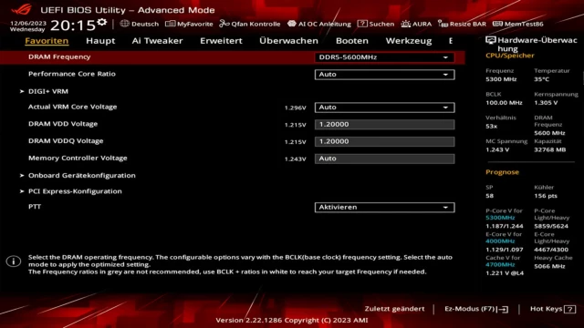 Das UEFI-BIOS ähnelt in Design und Aufbau den Varianten anderer ASUS ROG-Mainboards. In der ersten Ansicht werden Informationen über die verbaute Hardware und die Daten verschiedener Sensoren angezeigt. Die CPU-Temperatur wird in einem Diagramm angezeigt und auch die Steuerung des CPU-Lüfters wird grafisch dargestellt. In den Reitern am oberen Rand kann die Sprache eingestellt, eine Funktion gesucht und erweiterte Funktionen wie MemTest86 gestartet werden.