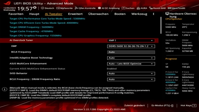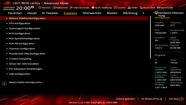 Mit der Taste F7 kann in den erweiterten Modus gewechselt werden. Hier können tiefgreifende Einstellungen zu Clocks und Timings von CPU und RAM vorgenommen werden. Der berühmt-berüchtigte Ai Tweaker bietet hier einige Hilfestellungen und Utilities, um mit wenig Aufwand mehr Leistung aus den verbauten Komponenten herauszuholen.
