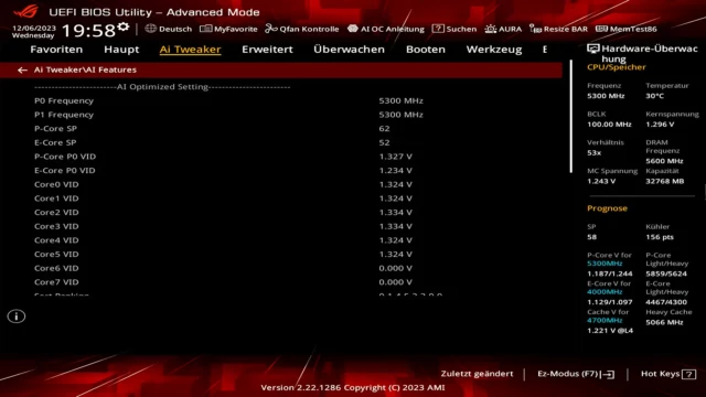 Die verfügbaren Einstellungen sind sehr umfangreich, so können beispielsweise für jeden Kern seperat Spannungen und Takte definiert werden. Weiterhin bietet das BIOS viele KI-Funktionen, um ohne tiefgehende Kennnisse die Leistung des Systems zu optimieren. Dabei bietet das Bios auch eine Einschätzung über die Leistung des CPU-Kühlers und mit der sogenannten „Silicon Prediction“ eine Einschätzung über die Qualität der CPU.