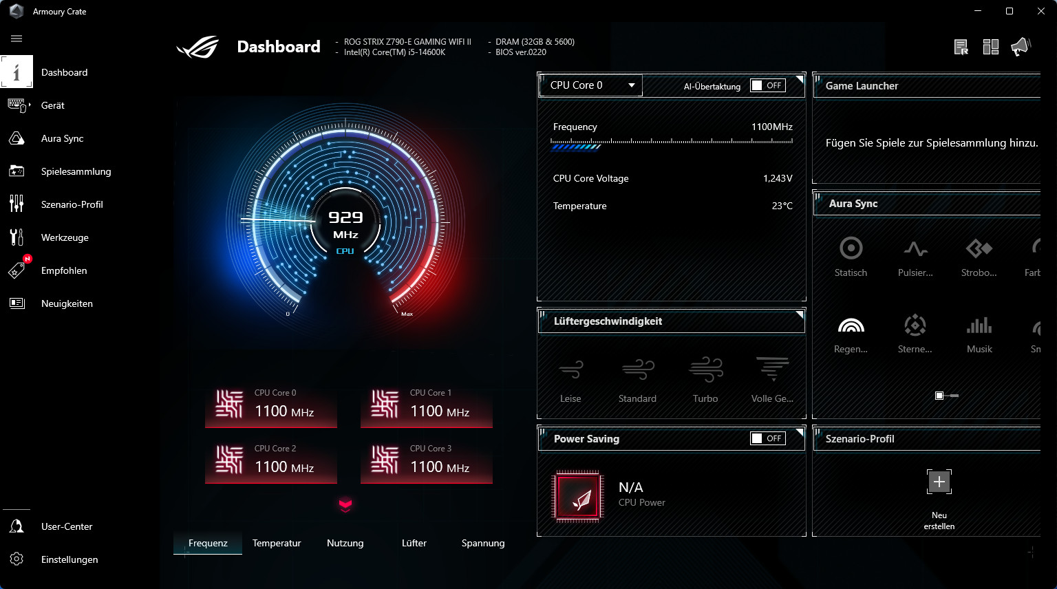Armory Crate bietet eine benutzerfreundliche Oberfläche, die es dem Benutzer ermöglicht, verschiedene Aspekte des Systems zu optimieren und anzupassen. Die Software ermöglicht nicht nur den Zugriff auf Hardwareinformationen, sondern auch die Anpassung der Einstellungen für andere ASUS-Komponenten. Dazu gehören die Steuerung von Lüftergeschwindigkeiten, RGB-Beleuchtungseffekten und Übertaktungsoptionen für eine optimale Leistung. Die Benutzeroberfläche ist sehr intuitiv zu bedienen und ermöglicht eine mühelose Anpassung der Systemkonfiguration. Auch Updates für Treiber und Systemkomponenten können mit Armory Crate installiert werden, um das System immer auf dem neuesten Stand zu halten. Allerdings gibt es einige Einschränkungen: Zum einen bietet Armory Crate keine Bios-Upgrades an, zum anderen sind neuere Versionen von Treibern teilweise auf der Website des Herstellers zu finden.