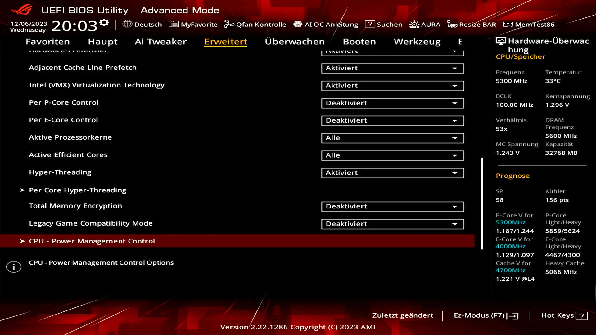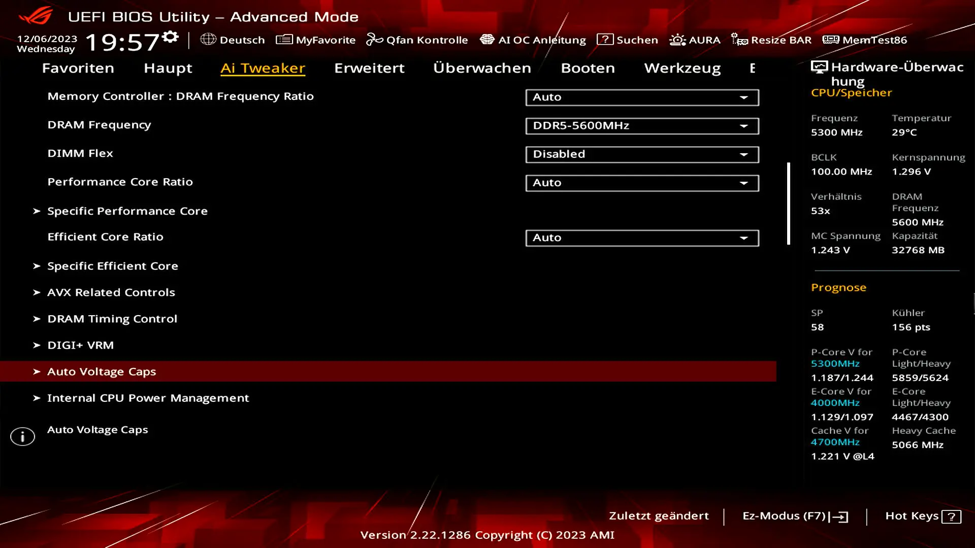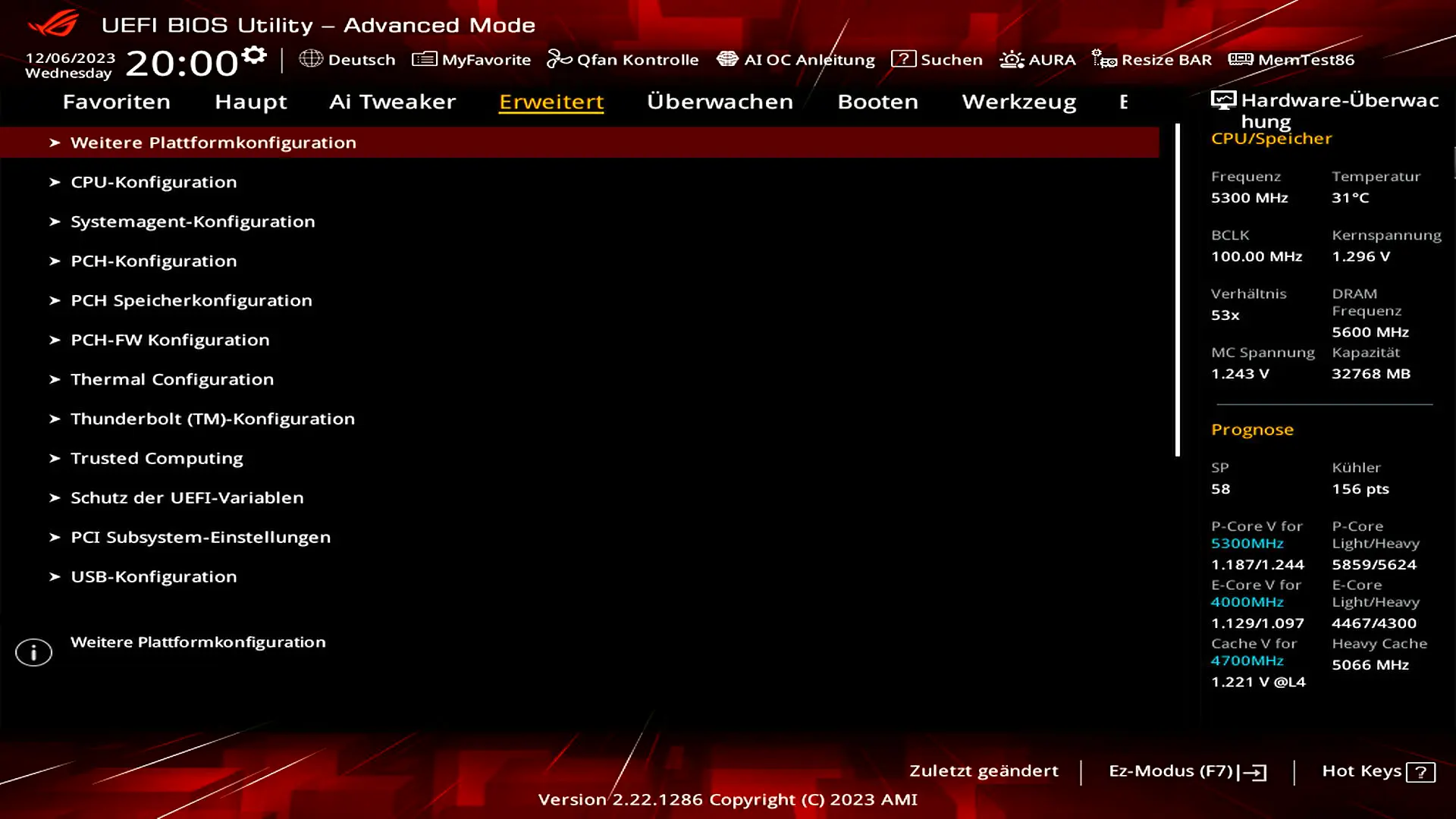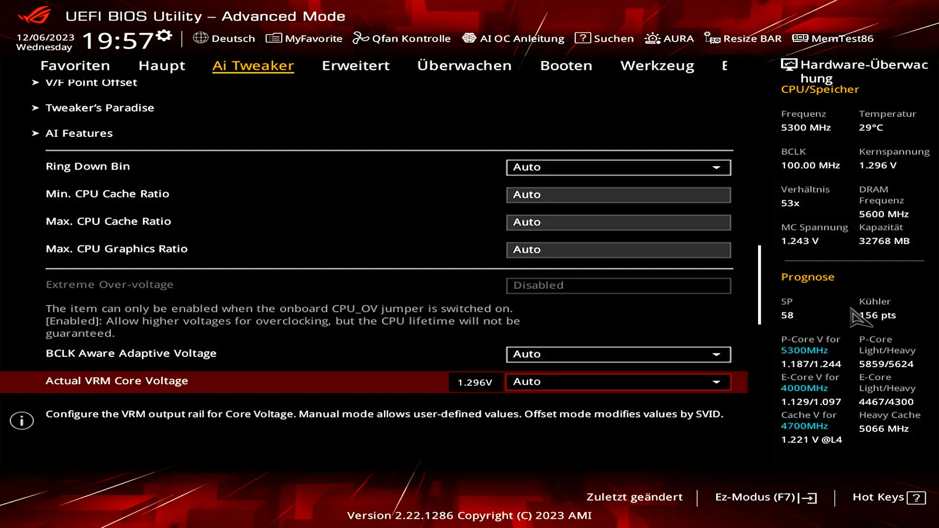 Die verfügbaren Einstellungen sind sehr umfangreich, so können beispielsweise für jeden Kern seperat Spannungen und Takte definiert werden. Weiterhin bietet das BIOS viele KI-Funktionen, um ohne tiefgehende Kennnisse die Leistung des Systems zu optimieren. Dabei bietet das Bios auch eine Einschätzung über die Leistung des CPU-Kühlers und mit der sogenannten „Silicon Prediction“ eine Einschätzung über die Qualität der CPU.