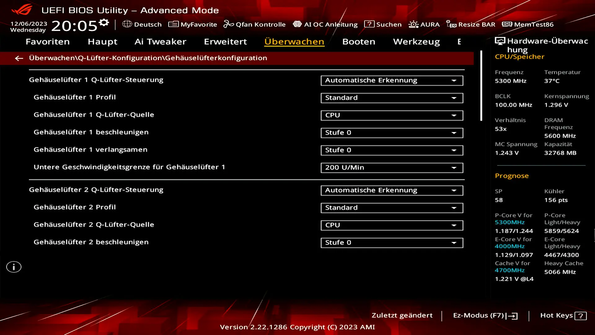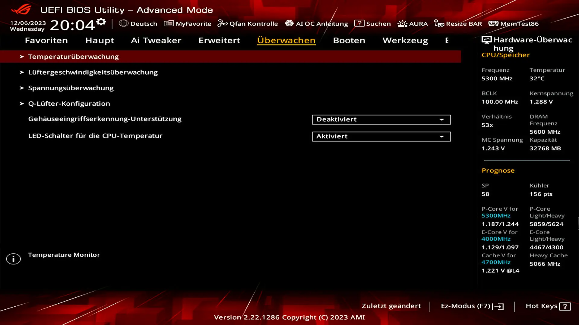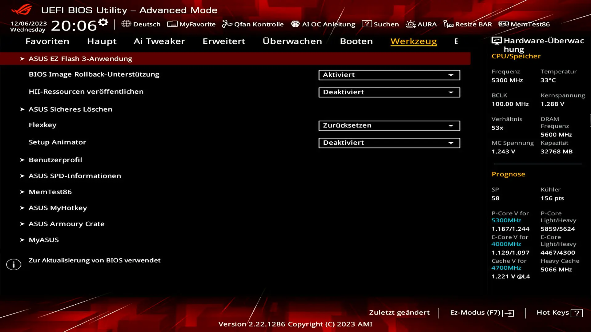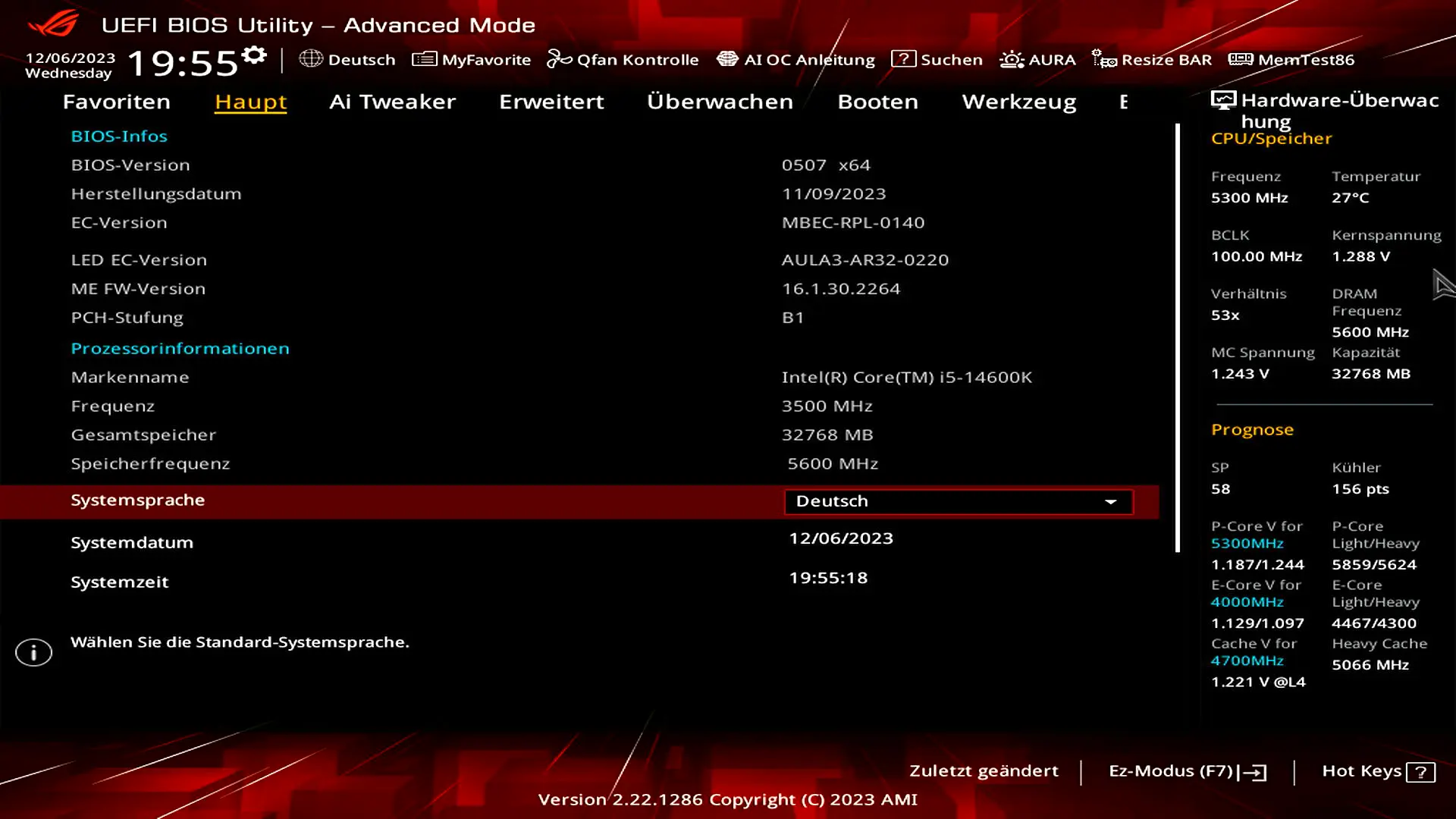 Die verfügbaren Einstellungen sind sehr umfangreich, so können beispielsweise für jeden Kern seperat Spannungen und Takte definiert werden. Weiterhin bietet das BIOS viele KI-Funktionen, um ohne tiefgehende Kennnisse die Leistung des Systems zu optimieren. Dabei bietet das Bios auch eine Einschätzung über die Leistung des CPU-Kühlers und mit der sogenannten „Silicon Prediction“ eine Einschätzung über die Qualität der CPU.