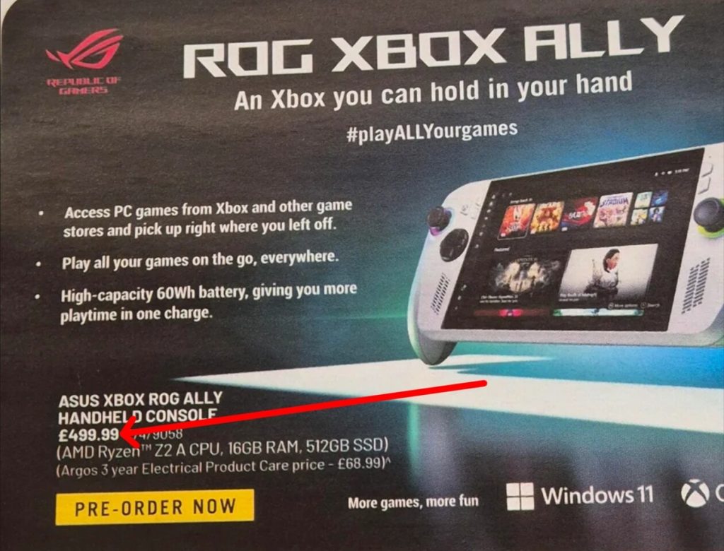 In den durchgesickerten Unterlagen ist ein Vorbestellpreis von 499,99 £ aufgeführt – umgerechnet etwa 605 US-Dollar. Zwar lassen sich Preise selten so direkt übertragen, doch die ASUS ROG Ally wird in Großbritannien für 549,99 £ und in den USA für 649,99 $ angeboten, was die Relation durchaus stützt. Microsofts Xbox-Konsolen hingegen werden üblicherweise im 1:1-Wechselkurs kalkuliert. Da ASUS jedoch offenbar für Produktion, Preisgestaltung und Vertrieb der Xbox Ally verantwortlich sein wird, ist es unwahrscheinlich, dass hier Microsofts Preispolitik übernommen wird.