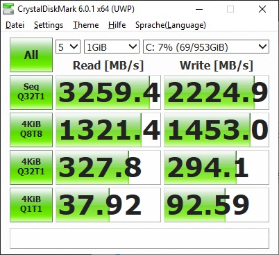 Im ASUS Zephyrus S GX701 gibt es aufgrund der Abmessungen keine Möglichkeit ein 2,5“ Laufwerk einzubauen. Dafür spendiert ASUS dem Notebook gleich eine 1 TB große NVMe SSD von Samsung. Beim Modell handelt es sich um die PM981 (MZVLB1T0HALR-00000) SSD. Samsung gibt eine Leseleistung von 3.200 MB/s und eine Schreibleitung von 2.400 MB/s an. Unser Test bestätigt diese Leistungsangaben noch einmal.