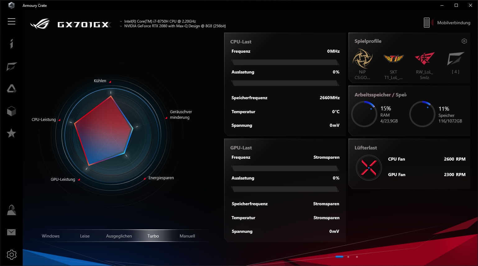 Zu einem guten Gaming-Notebook gehört auch die passende Software und hier bietet ASUS einiges an. Wir beginnen mit der Software „Armoury Crate“ – hier können nahezu alle Einstellungen zum Notebook eingestellt werden. Die Software ist gut strukturiert und lässt sich intuitiv bedienen. Auf der ersten Seite zeigt ein Diagramm die Auswirkungen des gerade gewählten Profils. In unserem Beispiel ist das Profil Turbo gewählt, wobei wir vorrangig die bestmögliche Leistung und Kühlung ohne Rücksicht auf Energieverbrauch oder Geräuschkulisse erreichen wollen. Neben den von uns gewählten Modus können noch vier weitere Modi gewählt werden. Wobei wir im Modus „Manuell“ alle Einstellungen mithilfe der Schieberegler weiter rechts erledigen können. Weiter werden hier auch die aktuellen Zustände von CPU, Speicher und Grafikkarte angezeigt.