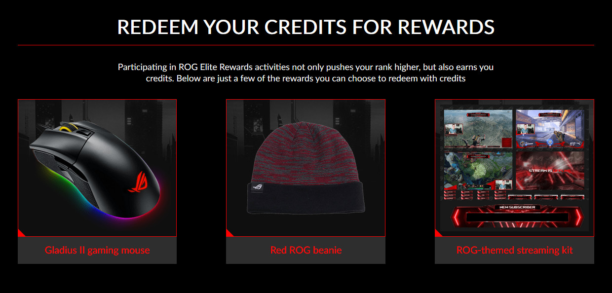 Elite Rewards, wie der Name schon sagt, ist ein Belohnungsprogramm für Benutzer mit einem Punktesystem, das Kunden zwischen Bronze-, Silber-, Gold-, Platin- und Diamantstufen unterscheidet, wobei jede Stufe mit steigenden Belohnungen versehen ist. Benutzer können ihren ROG Elite Score durch Battle (Gaming) Feats, Adventuring (zu den ASUS Events gehen), Craft (Punkte verdienen durch ASUS‘ Content Creation Contests) und durch den Kauf ausgewählter ROG-Produkte erhöhen. Alle diese Aktivitäten geben einem Spieler Punkte für seine Elite-Belohnungen und erhöhen gleichzeitig die Position eines Spielers in der ROG-Arena-Rangliste.