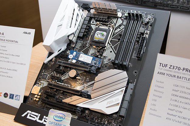 Das andere Z370-Chipsatz-Motherboard, das ASUS ausgestellt hatte, war das Prime Z370-A. Es teilt viele der gleichen Spezifikationen wie die TUF-Z370 Pro Gaming, aber mit weniger USB-Ports und einer anderen Ästhetik.