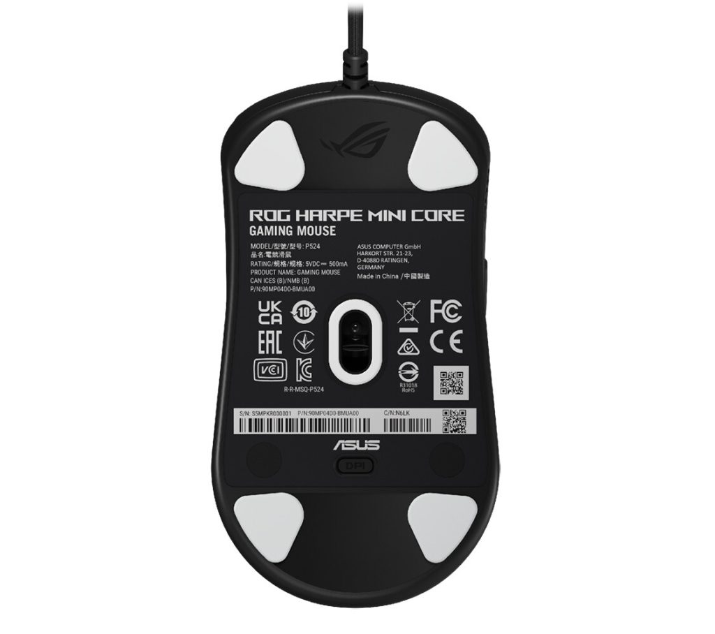 Im Inneren arbeitet ein 12.000-dpi-Sensor, ergänzt durch austauschbare ROG Micro Switch II für die Haupttasten. Die technischen Daten umfassen eine Geschwindigkeit von 300 IPS sowie eine Beschleunigung von 35G – deutlich abweichend von den 42.000 dpi und 750 IPS der Harpe Ace Mini.