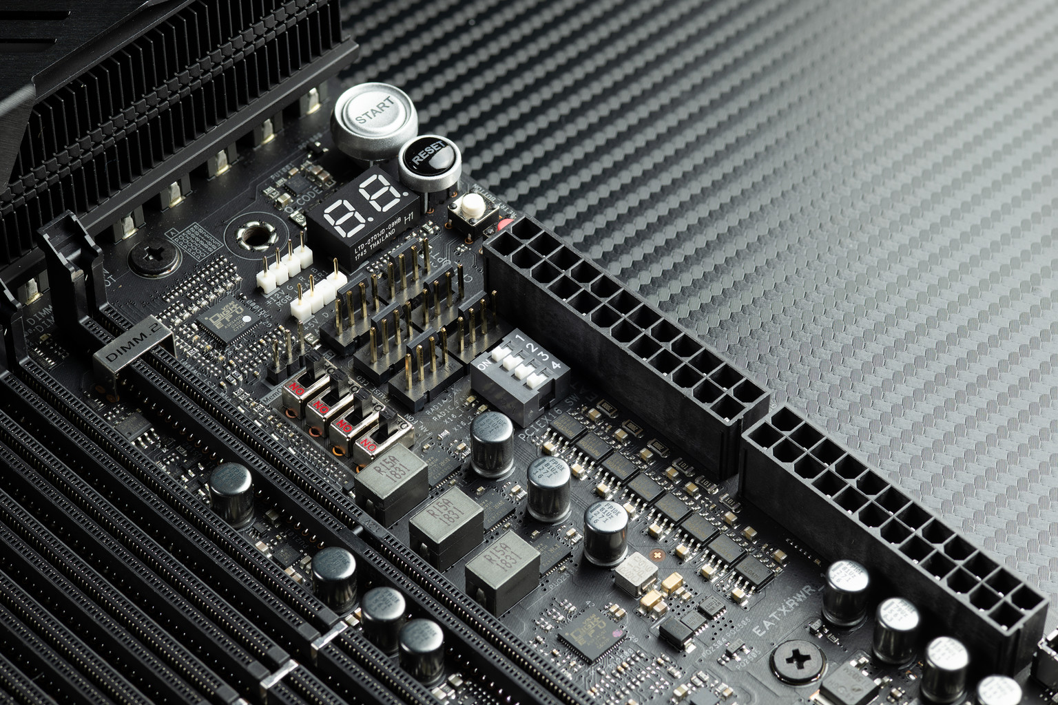 Die Versorgung einer solchen potenten Plattform erfordert enorme Leistung, weshalb Sie zwei Netzteile anschließen können. Unter den neun EATX-Stromsteckern sind sechs ausschließlich für 12V-Strom bestimmt. Über die gesamte Breite des Boards erstrecken sich 32 Power-Phasen, die sich unter einem großen Kühlkörper mit aktiver Kühlung absetzen. Vier Lüfter sind im Inneren versteckt und spinnen nur hoch, wenn die Thermik es erfordert. Der Rest der Plattenkühlung ist maßgeschneidert für kundenspezifische Flüssigkeitsschleifen, beginnend mit Headern, die Temperaturerfassung, Strömungsüberwachung und Lecksuche für kompatible CPU-Blöcke unterstützen.