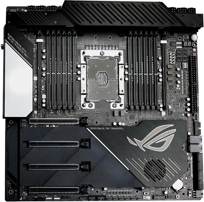 Bei diesem Board geht es darum, ROG-Sensibilität in einem viel größeren Maßstab anzuwenden. Trotz der Tatsache, dass es einen massiven 14 „x 14“ EEB-Formfaktor einnimmt, hat es keinen Platz übrig. Der Sockel ist umgeben von einem Dutzend DDR4-DIMM-Steckplätzen mit Unterstützung für bis zu 192 GB RAM und der Speicher wird von Dual-DIMM.2-Modulen mit Platz für vier NVMe SSDs zwischen ihnen flankiert. Dual-U.2-Ports bieten Konnektivität für zusätzliche NVMe-Laufwerke, während vier PCIe-x16-Slots für einen Stapel von Grafikkarten aufgereiht sind. Um Engpässe zu umgehen, ist das alles direkt mit der CPU verbunden.