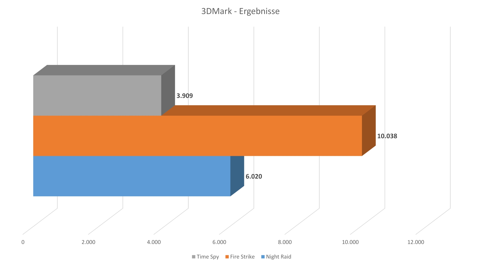 Zu unseren Tests gehören auch verschiedene Grafik-Benchmarks. Den Anfang machen wir hier mit den drei aktuellsten Tests aus der aktuellen 3DMark Version. Bei Time Spy handelt es sich um einen anspruchsvollen DirectX 12 Benchmark, bei dem das ASUS TUF FX505 gut 3.909 Punkte erreicht. Im älteren Fire Strike Benchmark werden etwas über 10.000 Punkte erreicht. Neu dabei ist jetzt der Night Raid Benchmark, der sich vor allem für Notebooks und Tablets eignet. Das sind insgesamt gute Ergebnisse.