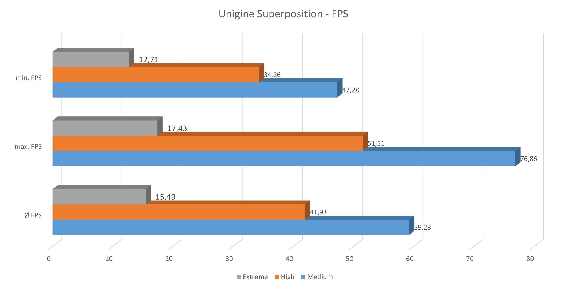 Mit dem Superposition Benchmark von Unigine geht es nun weiter. Hier testen wir in den drei Einstellungen Medium, High und Extreme. Auch hier bildet sich die Leistung dieses Notebooks gut ab. Die verbaute GeForce GTX 1060 erreicht während der Superposition Durchläufe bis zum 75 Grad.