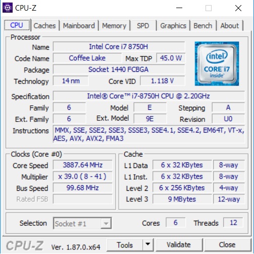 Intel Core i7-8750H 6/12 2,20 GHz 4,10 GHz |